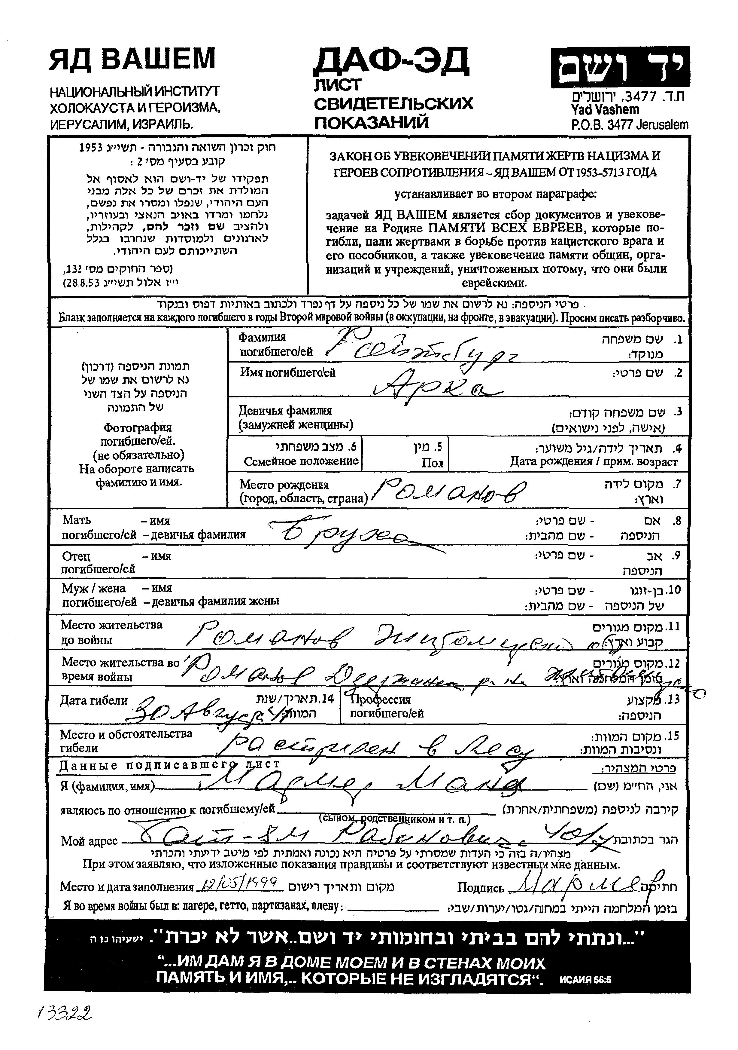 Arka Roitburg was born in Romanov, Ukraine (USSR) to Brukha. Prior to WWII he lived in Romanov, Ukraine (USSR). During the war he was in Romanov, Ukraine (USSR). Arka was murdered in the Shoah. Place of death: unknown, 30/08/1941.