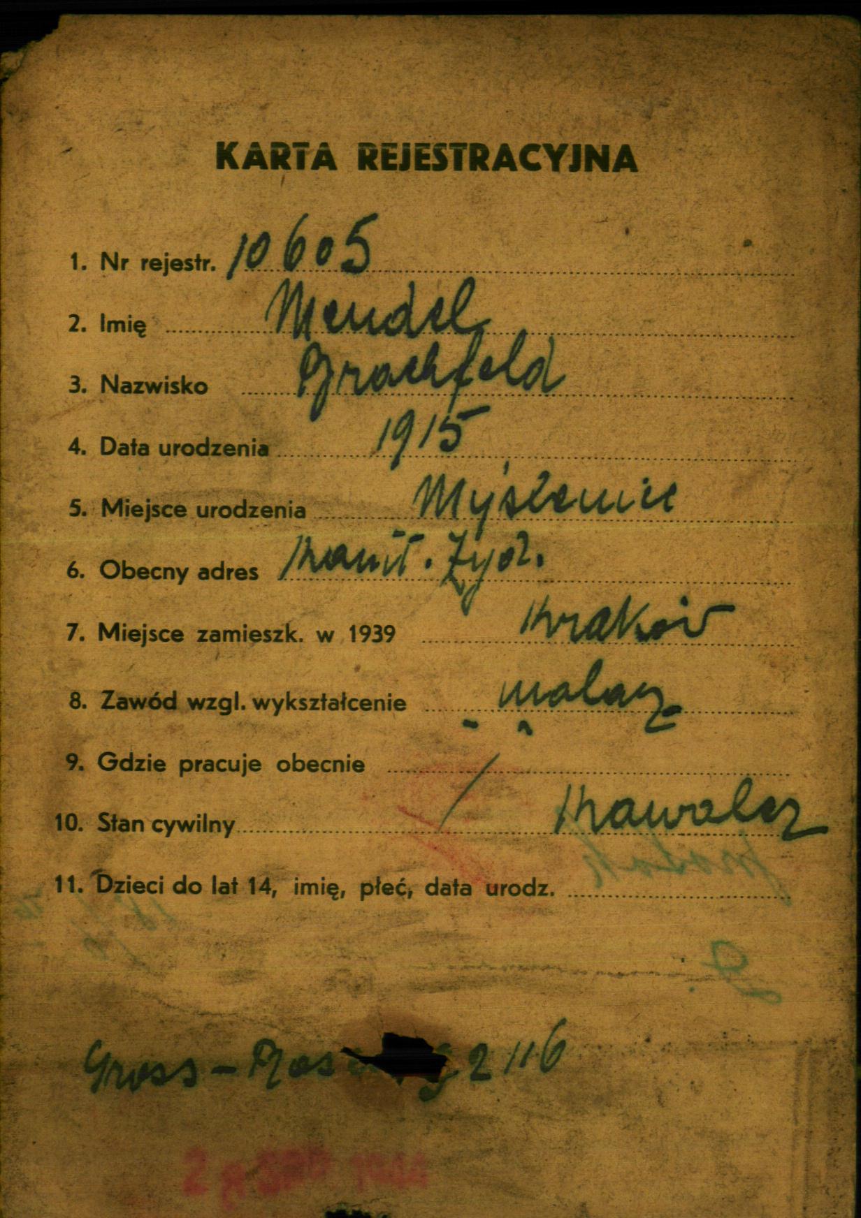 Mendel Branfeld was born in Myslenice, Poland, 1915. He was a painter and single. Prior to WWII he lived in Krakow, Poland. During the war he was in Gross Rosen, Germany. Mendel survived the Shoah.