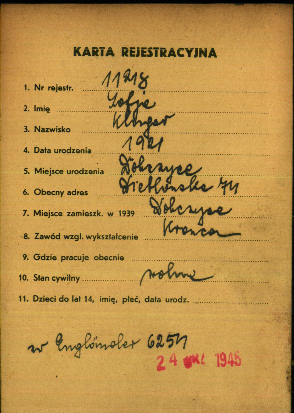 Zofja Kluger was born in Dobczyce, Poland, 1921. She was a seamstress and single. Prior to WWII she lived in Dobczyce, Poland.
