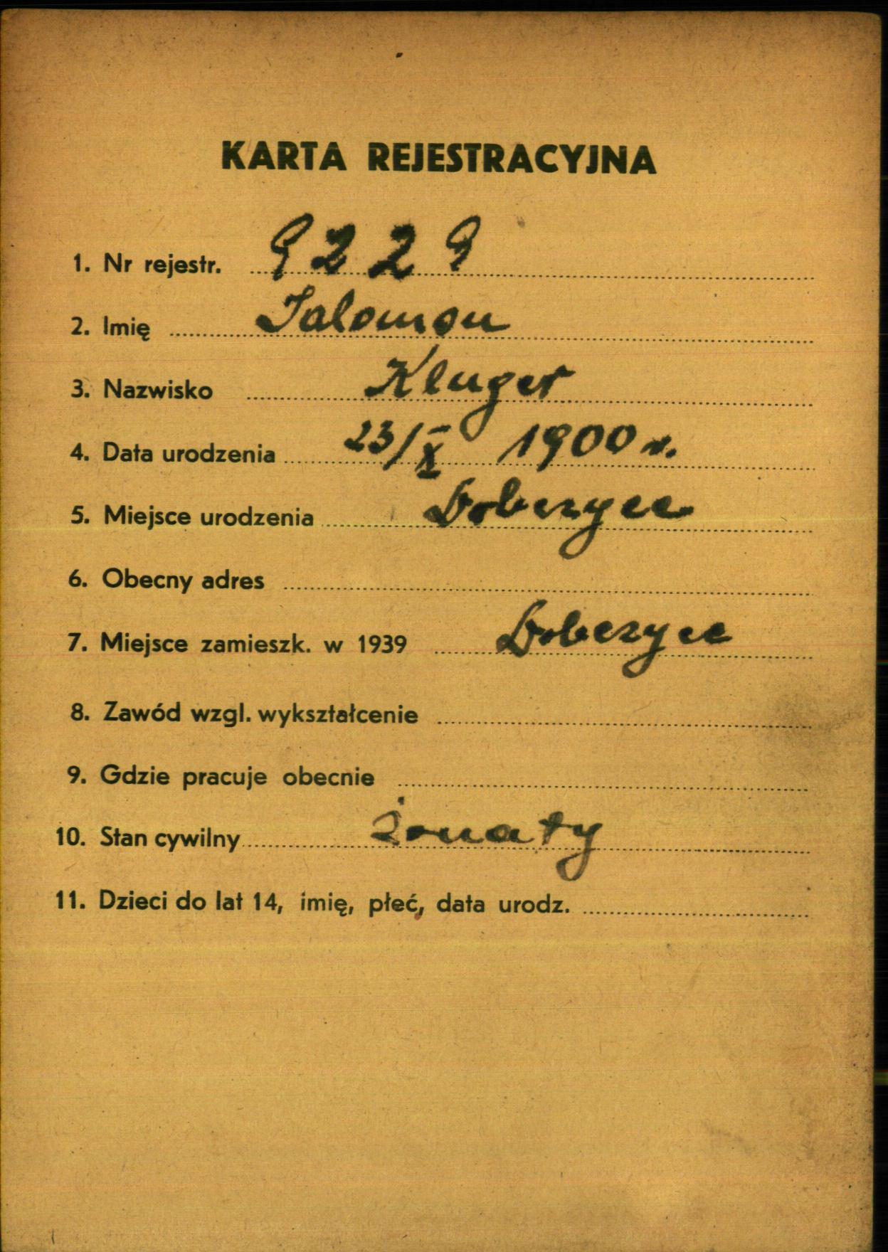 Salomon Kluger was born in Dobczyce, Poland, 1900. He was married. Prior to WWII he lived in Dobczyce, Poland.