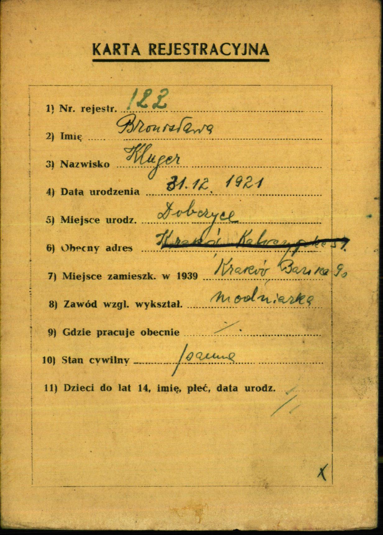 Bronisława Kluger was born in Dobczyce, Poland, 1921. She was a milliner and single. Prior to WWII she lived in Krakow, Poland.