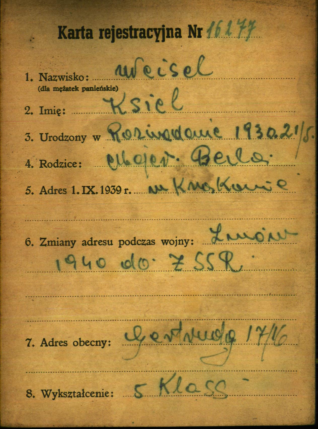 Kisiel Weisel was born in Rozwadów, Poland, 1930 to Majer and Beila. He was child. Prior to WWII he lived in Krakow, Poland. During the war he was in Soviet Union. Kisiel survived the Shoah.
