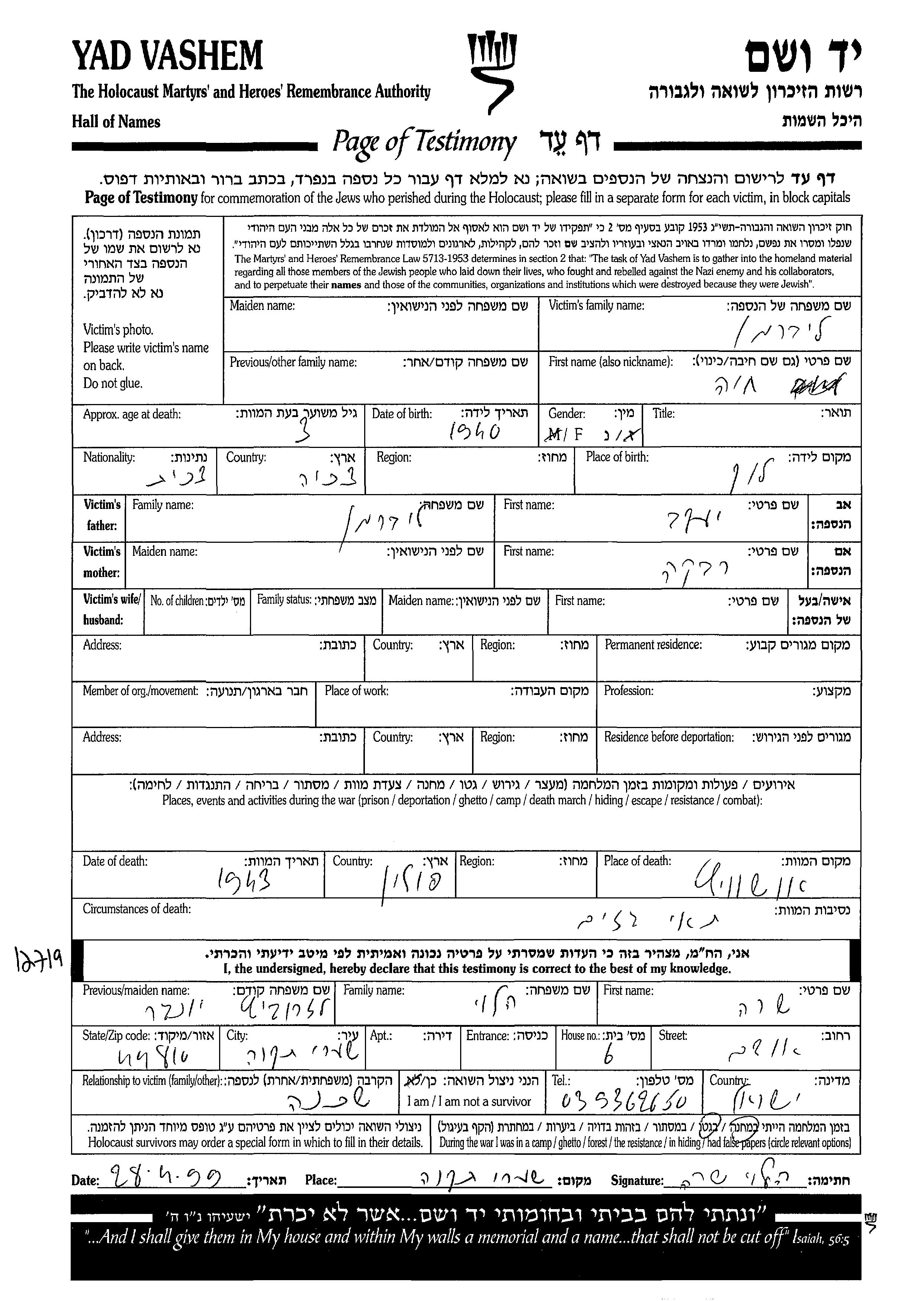 Yad Vashem - Pages of Testimony Names Memorial Collection