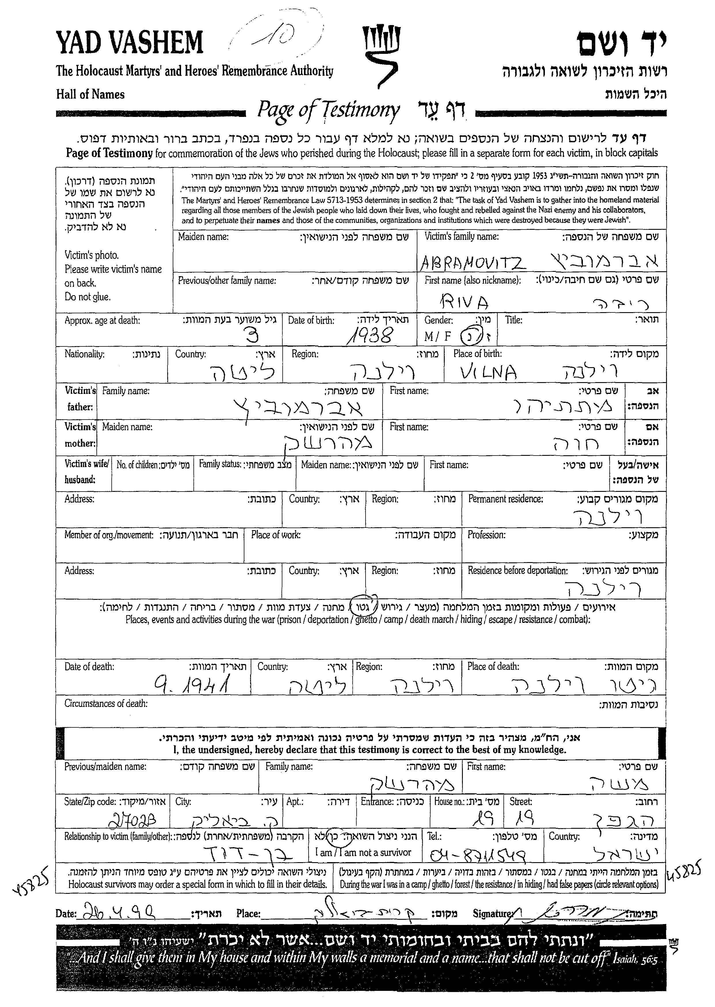 Abramovitz Riva 1938 Vilna, Poland Page of Testimony
