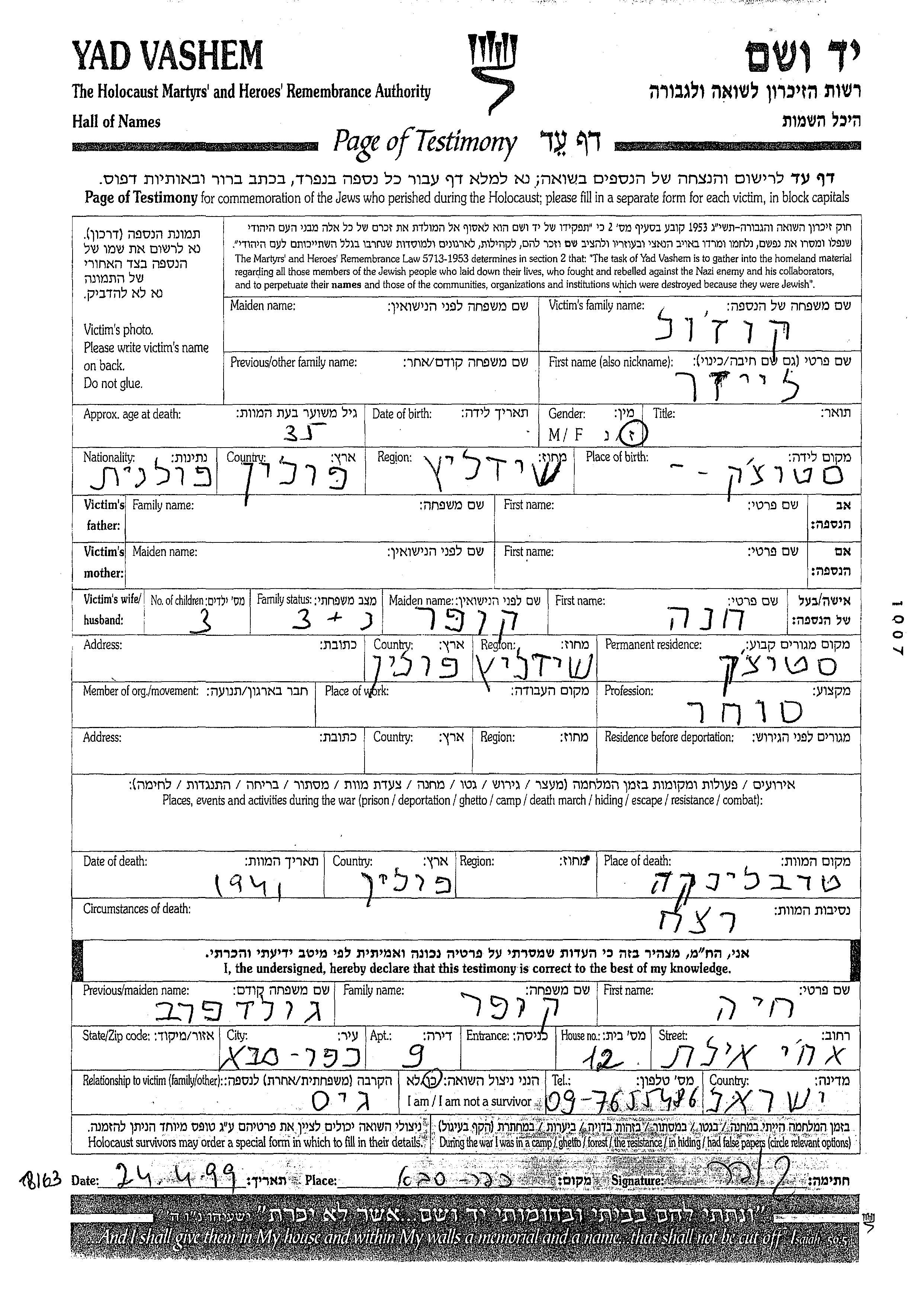 Leizer Kozol was born in Stoczek, Poland. He was a merchant and married to Khana nee Kuper. Prior to WWII he lived in Stoczek, Poland. Leizer was murdered in the Shoah. Place of death: Treblinka, Poland, 1941.