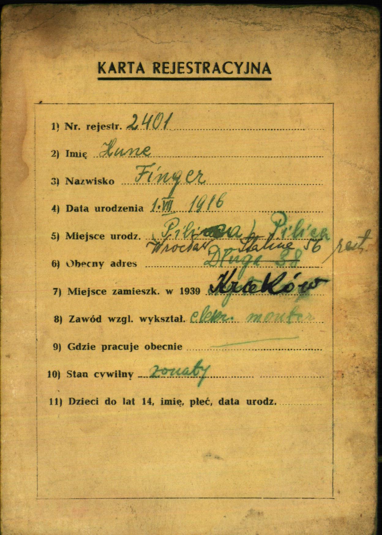 Hune Finger was born in Pilica, Poland, 1916. He was an electrician and married. Prior to WWII he lived in Krakow, Poland.