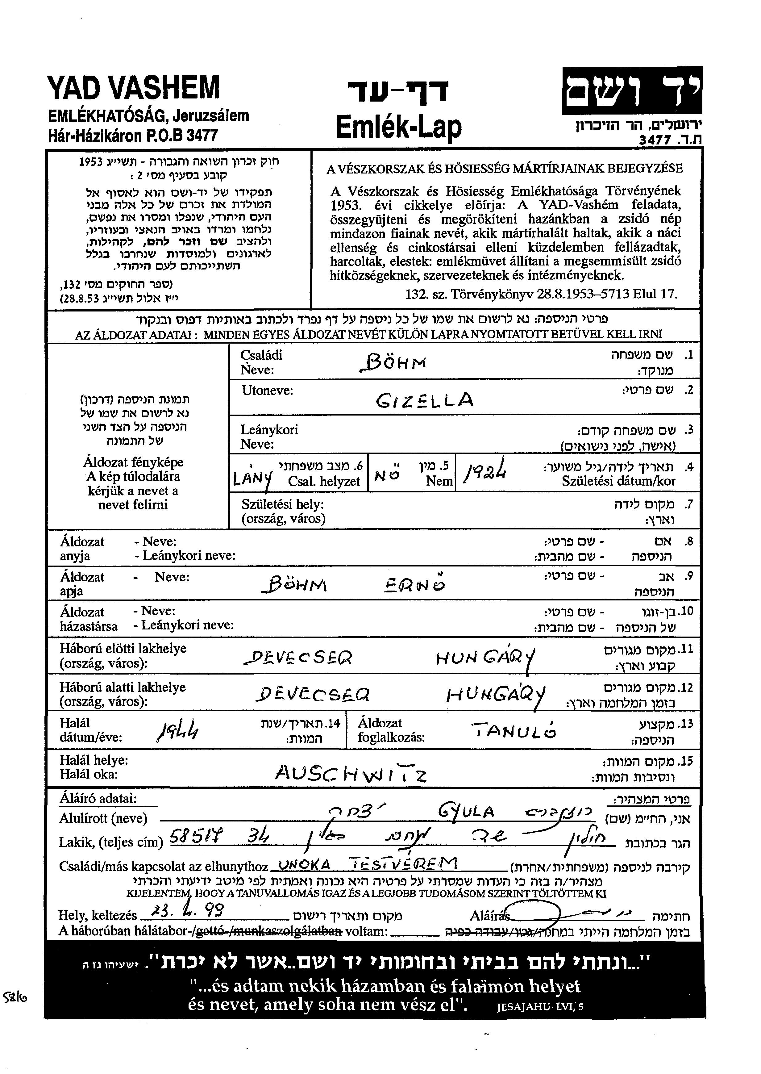 Gizella Boehm was born, 1924 to Erno. She was a pupil and single. Prior to WWII she lived in Devecser, Hungary. During the war she was in Devecser, Hungary. Gizella was murdered in the Shoah. Place of death: Auschwitz, Poland, 1944.