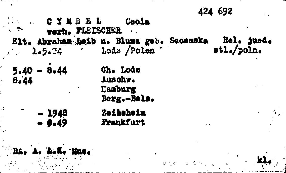 Cesia Fleischer Cymbal nee Cymbel was born in Lodz, Poland, 1921. Prior to WWII she lived in Lodz, Poland.