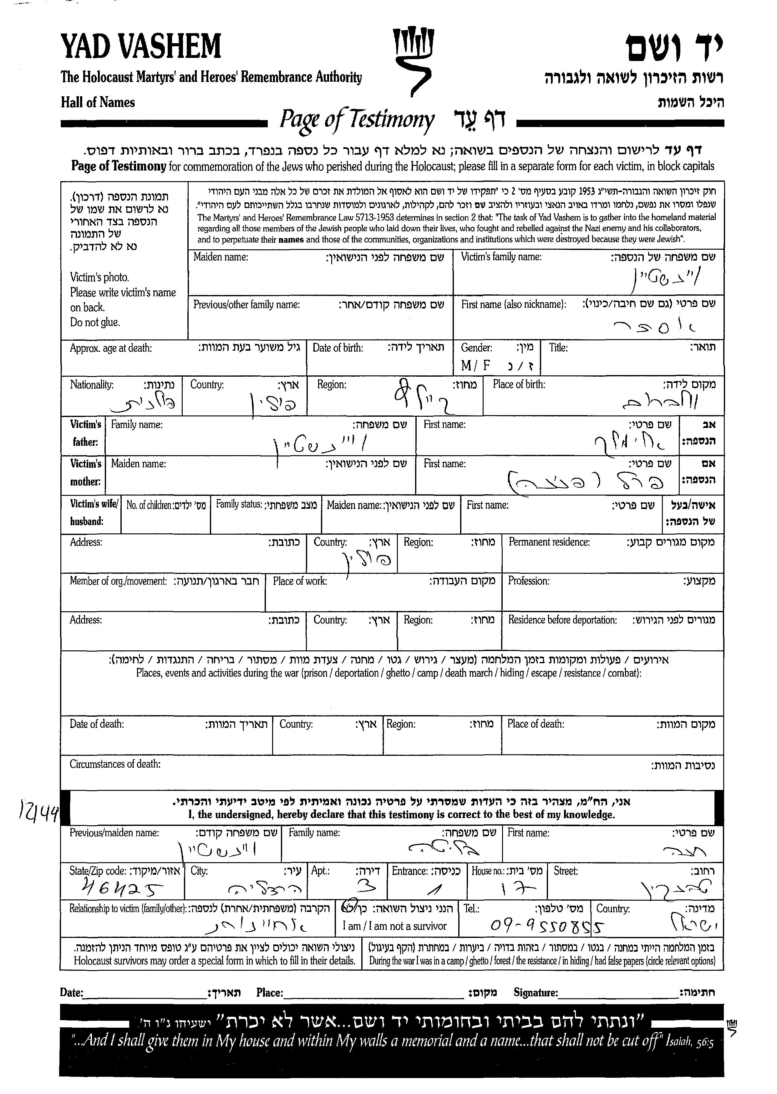 Yad Vashem - Pages of Testimony Names Memorial Collection