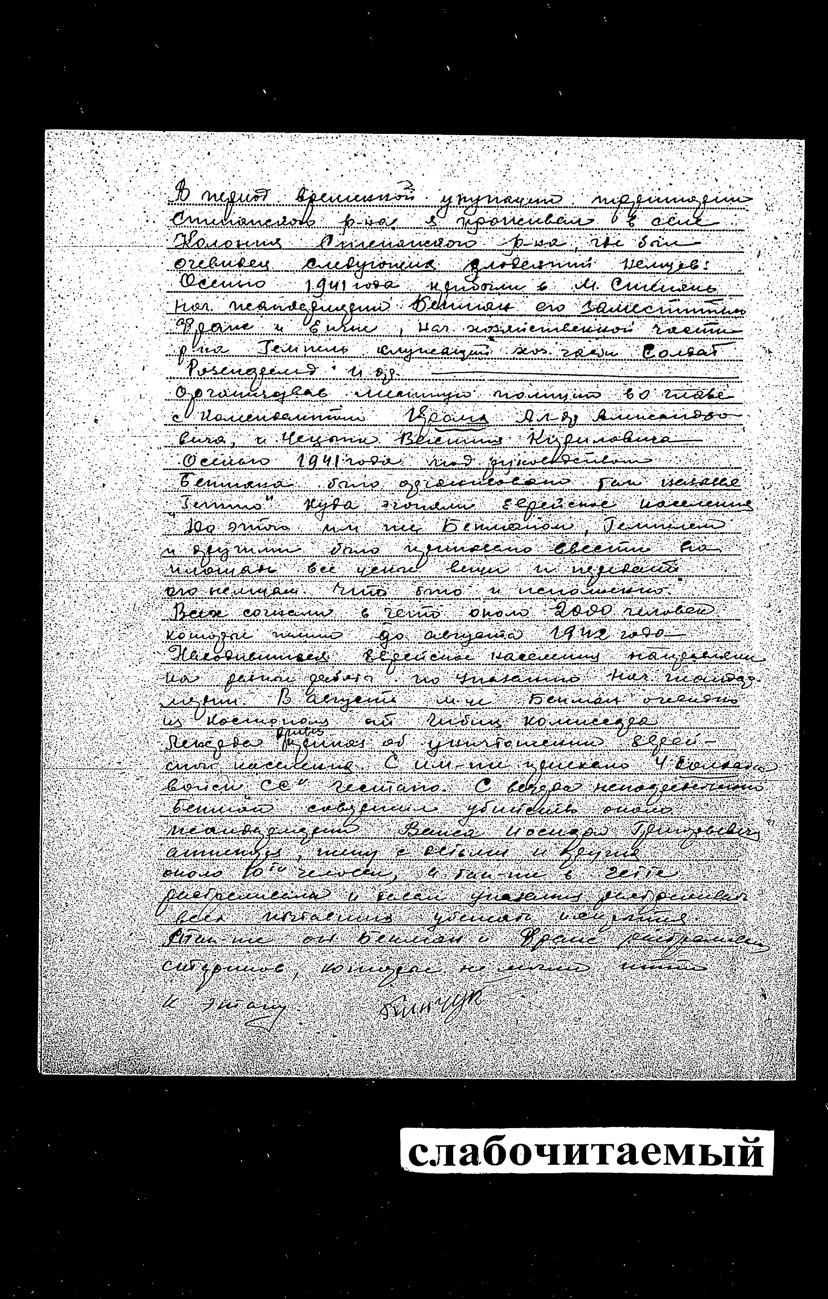 On August 25 (or August 22 or 24), 1942, during the liquidation of the Stepań Ghetto, Gendarmerie chief Beckmann, his deputy Franz, and the landwirte (senior German official of the town) Gempel instructed the police to kill the elderly people and the small children, who could not walk, in the ghetto itself. Some of the inmates, who tried to escape from the ghetto, were shot on the spot, as well. Beckmann, Franz, and Gempel shot some of the victims with their own hands. Thus, according to the ChGK document, approximately 50 ghetto inmates were killed on the spot.