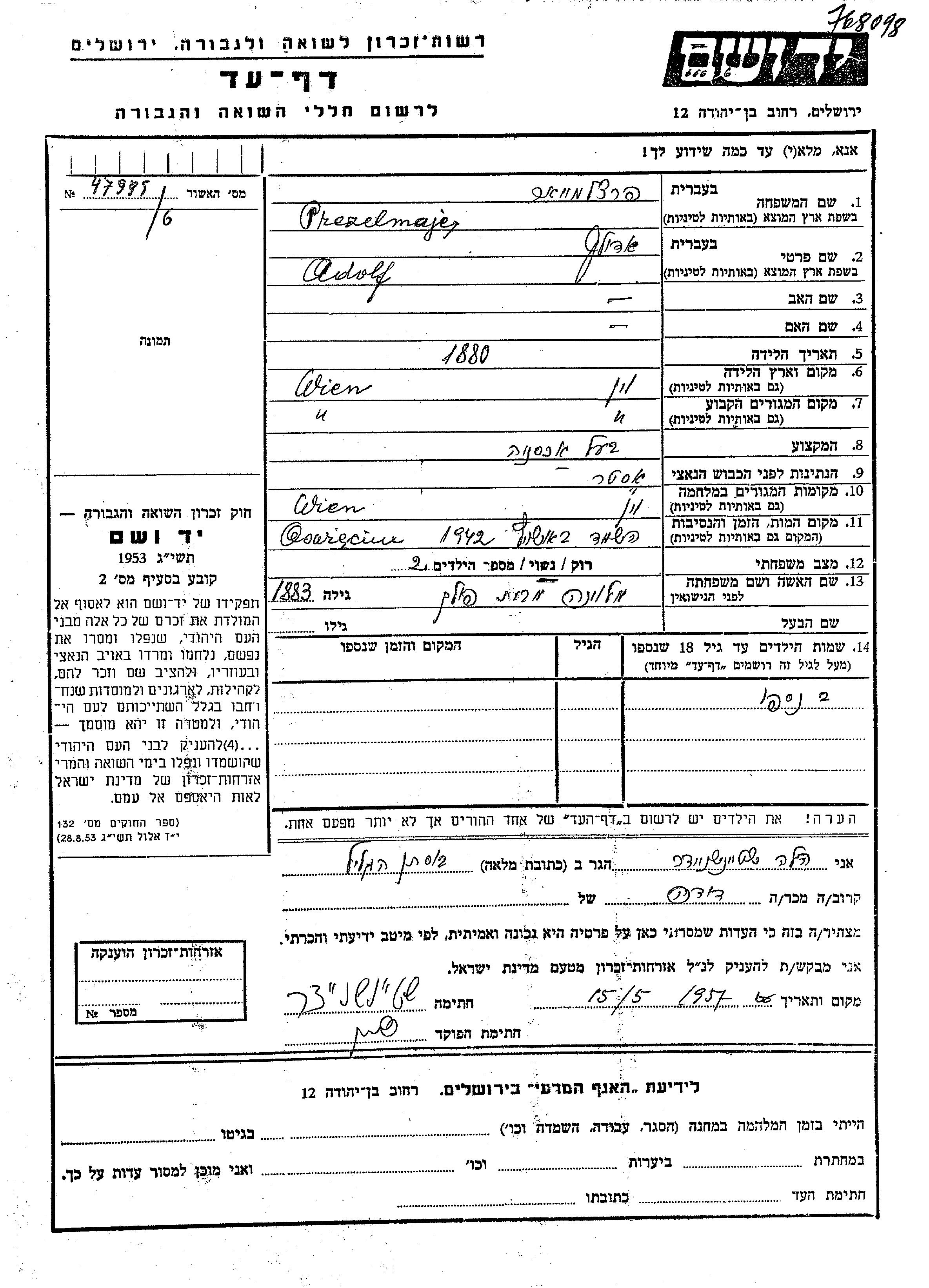 Adolf Prezelmajer nació en Wien, Austria en 1880. Era Posadero y Casado con Malvina apellido de soltera Polak. Antes de la segunda guerra mundial vivía en Wien, Austria. Durante la guerra estuvo en Wien, Austria.