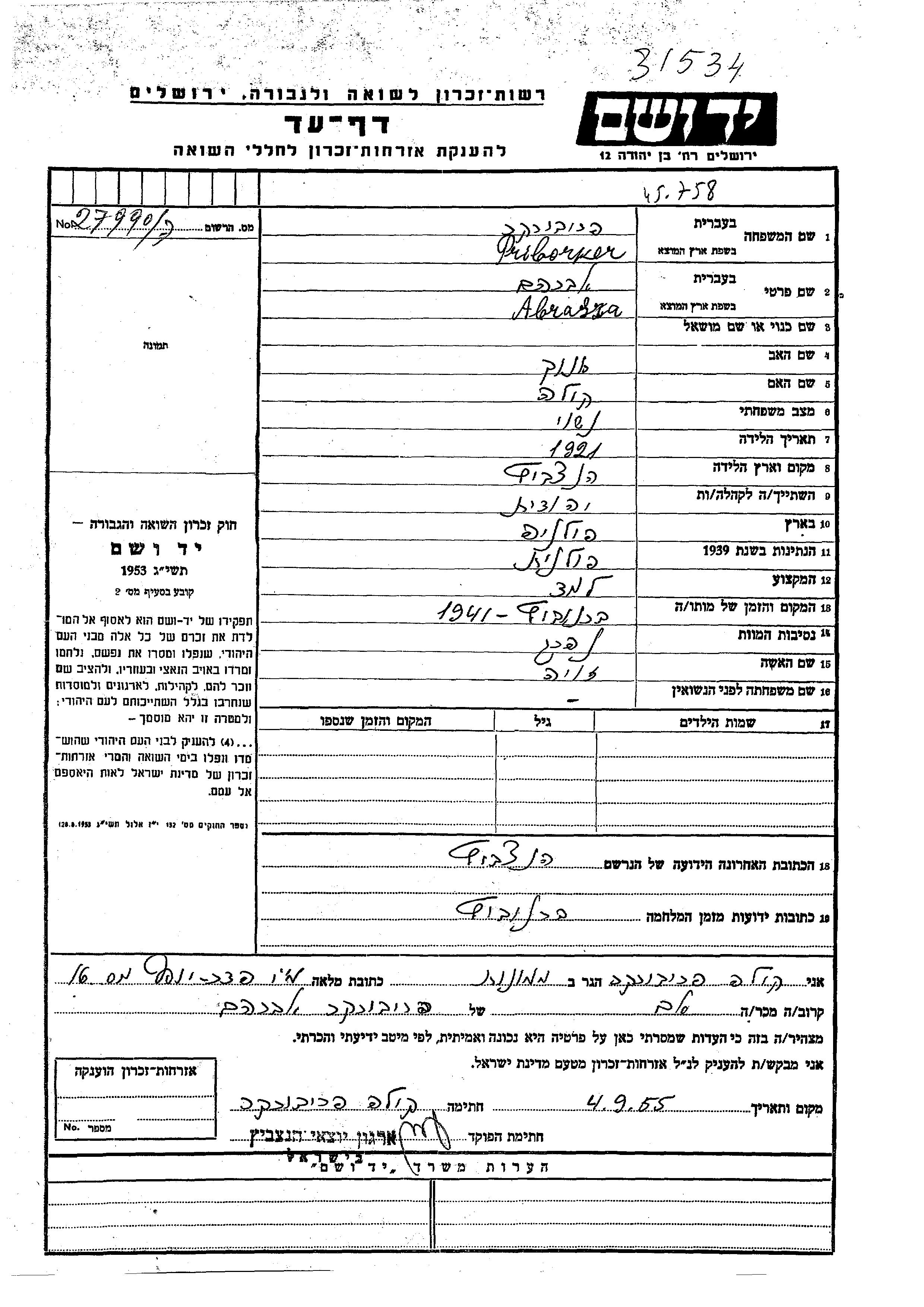 Priborker Abrasza 1921 Hancewicze, Polonia Hoja de Testimonio