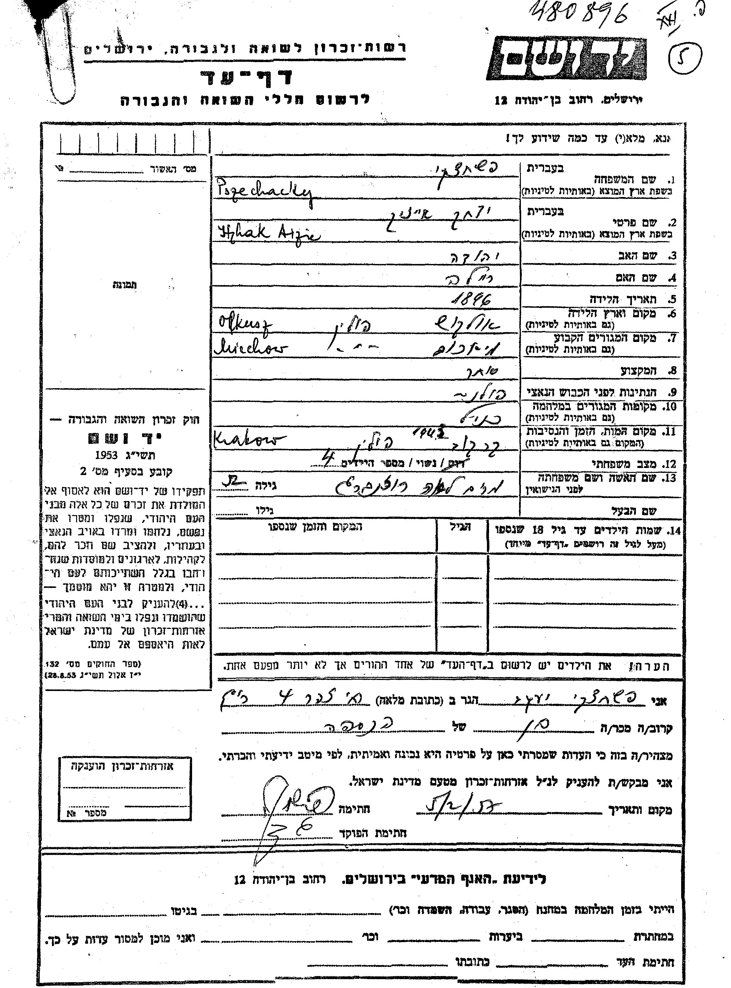 Ytzhak Pszechacky nació en Olkusz, Polonia en 1896, hijo de Yehuda y Reila. Era Comereciante y Casado con Miriam Lea apellido de soltera Rozenberg. Antes de la segunda guerra mundial vivía en Miechów, Polonia. Durante la guerra estuvo en Miechów, Polonia.