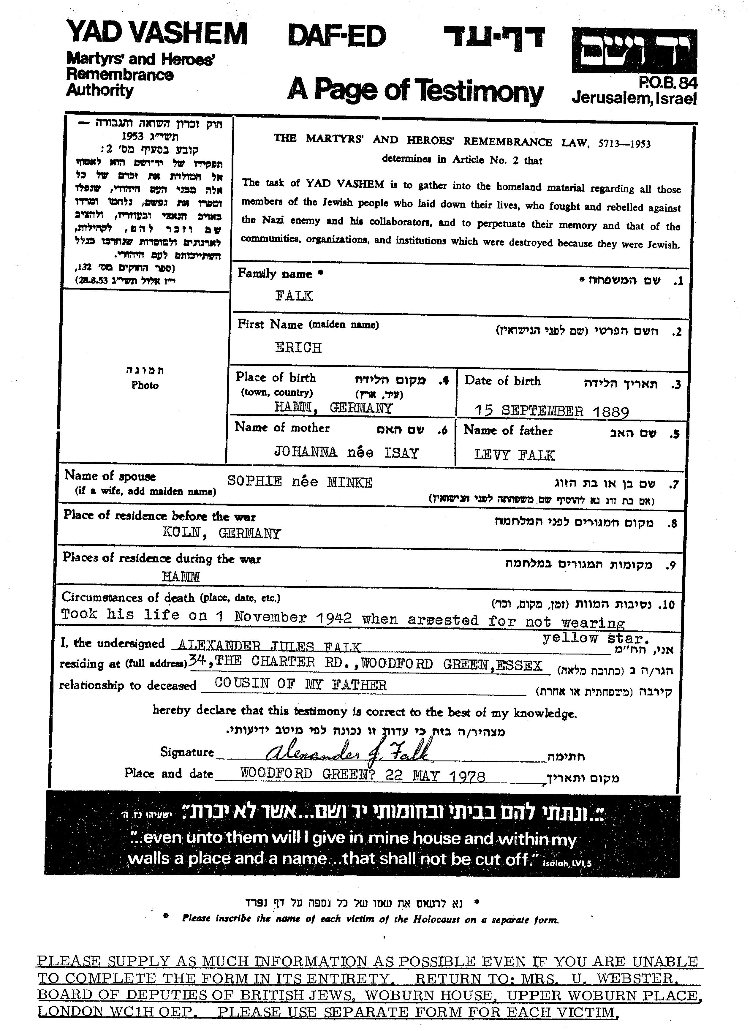 Erich Falk nació en Hamm, Alemania en 1889, hijo de Levy y Johanna. Era Casado con Sophie apellido de soltera Minke. Antes de la segunda guerra mundial vivía en Koln, Alemania. Durante la guerra estuvo en Hamm, Alemania.