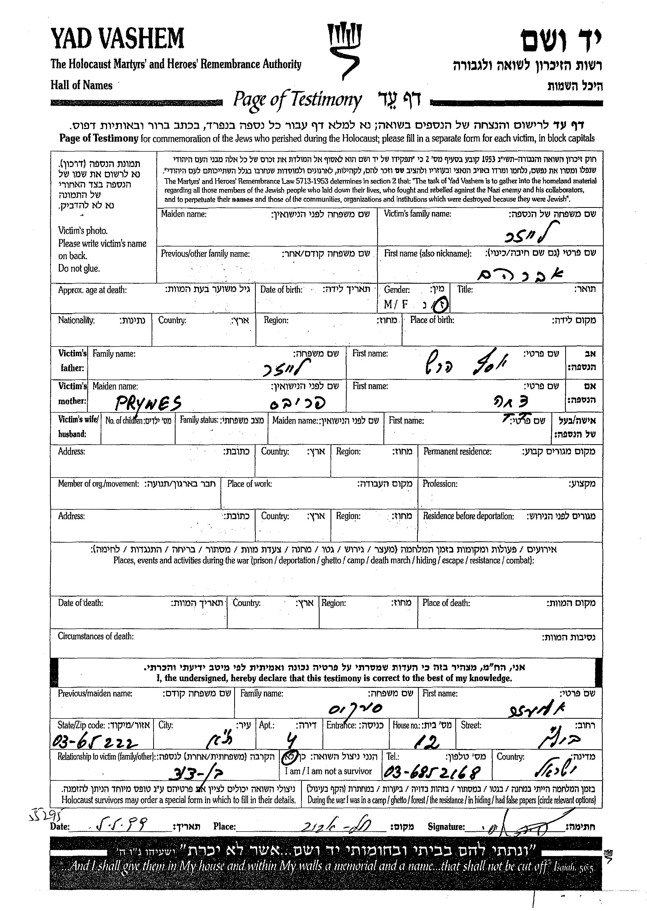 Leizer Avraham lugar desconocido, Hoja de Testimonio