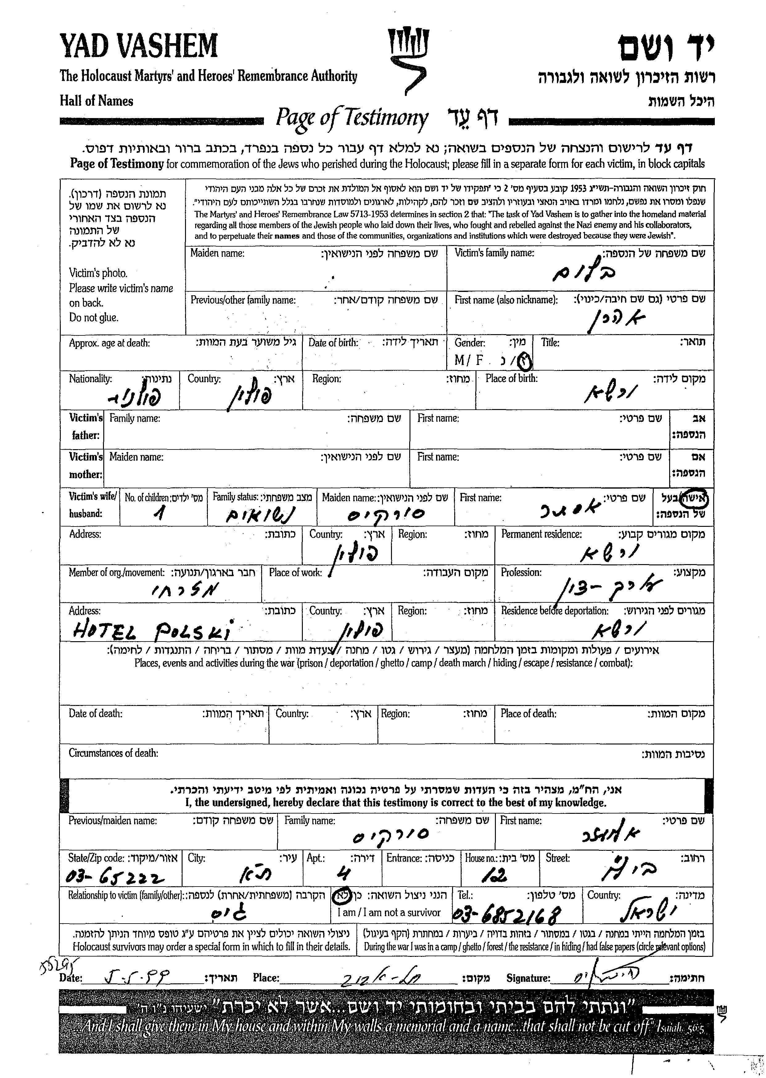 Blum Aharon Warszawa, Polonia Hoja de Testimonio