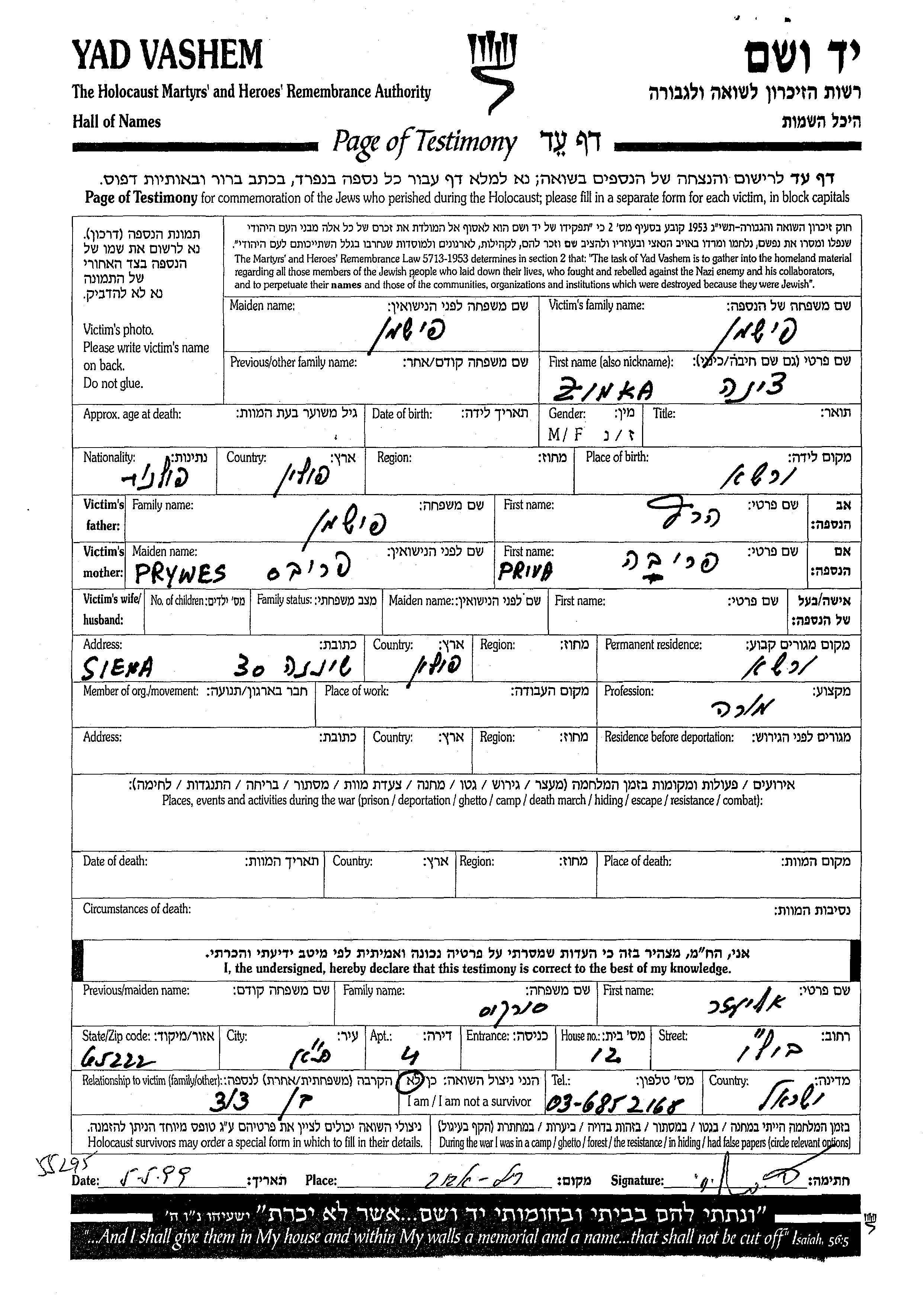 Fishman Zinka Dina Warszawa, Polonia Hoja de Testimonio