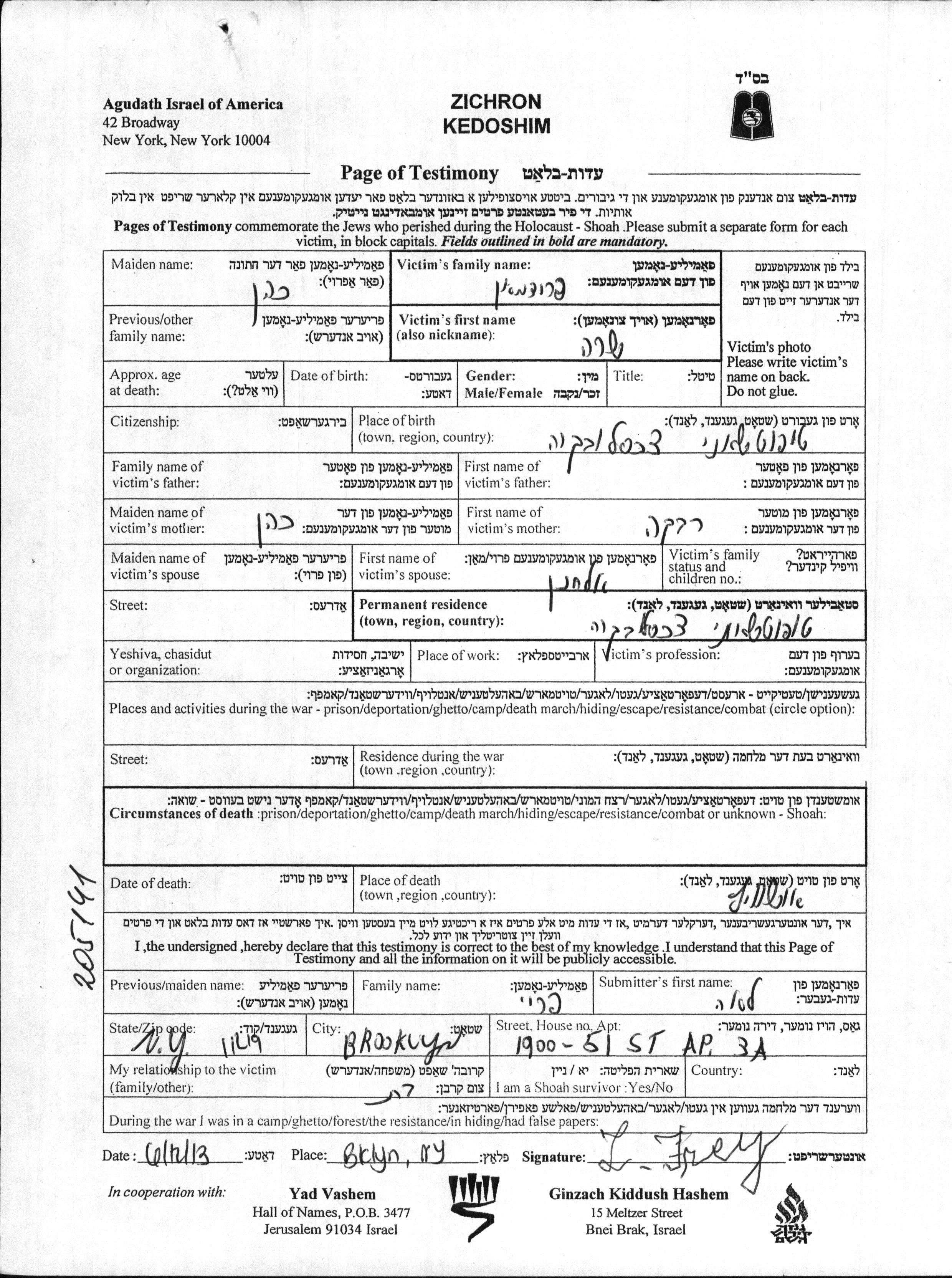 Sara Fridman apellido de soltera Kohen nació en Topocani, Checoslovaquia, hija de Rivka apellido de soltera Kohen. Era casada con Elkhanan. Antes de la segunda guerra mundial vivía en Topocani, Checoslovaquia. Sara fue asesinada durante la Shoá. Lugar de la muerte: Auschwitz, Polonia.