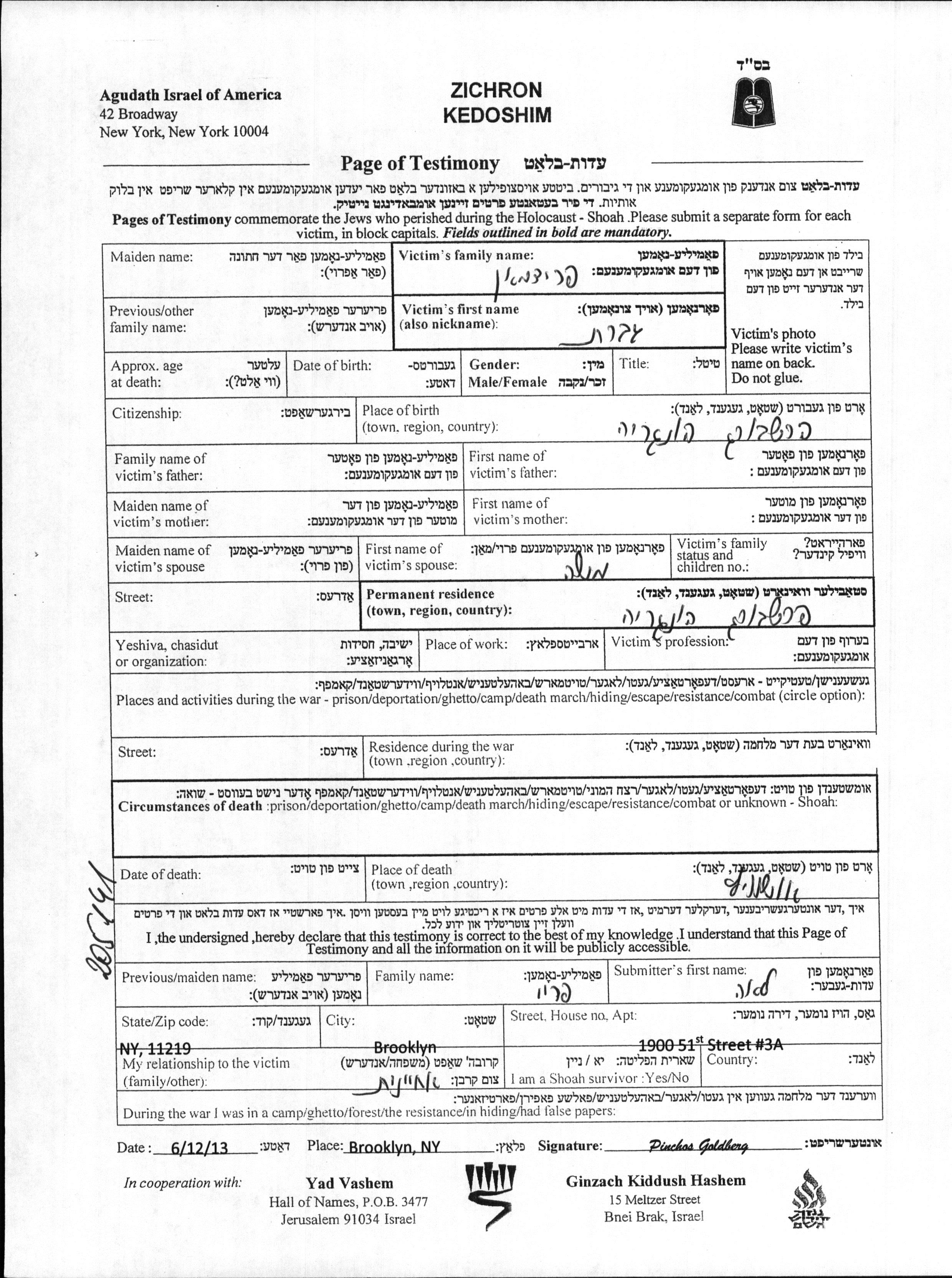 nombre desconocido Fridman nació en Pressburg, Checoslovaquia. Era casada con Moshe. Antes de la segunda guerra mundial vivía en Pressburg, Checoslovaquia. Ella fue asesinada durante la Shoá. Lugar de la muerte: Auschwitz, Polonia.