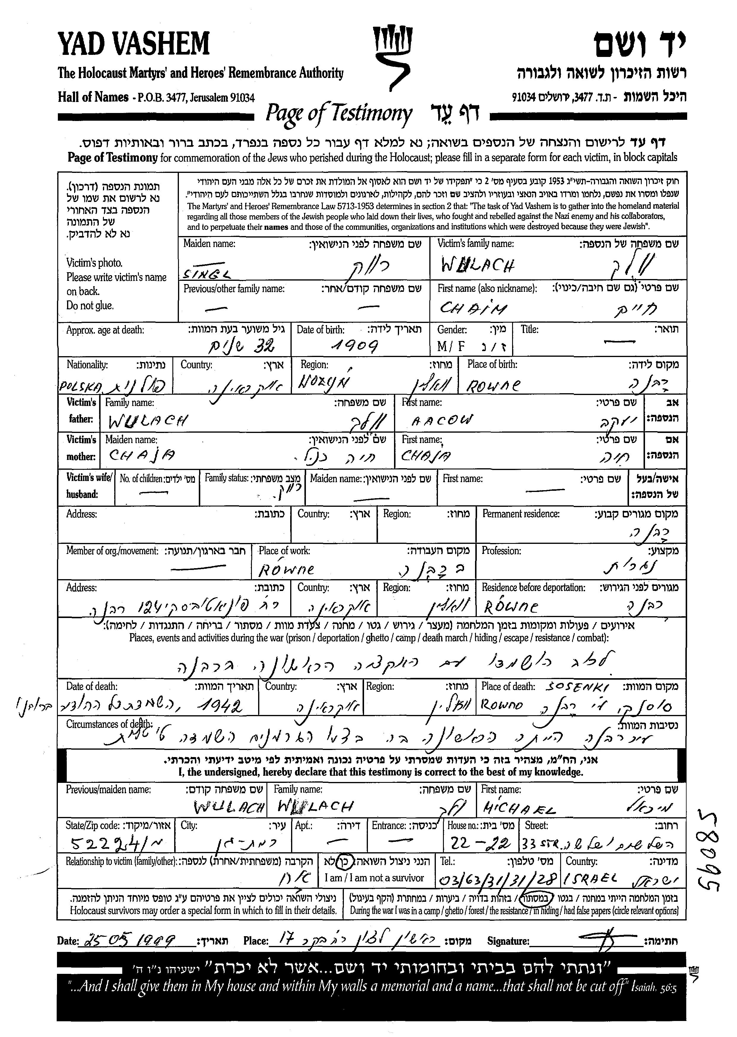Wulach Volakh Chaim 1909 Rowne, Polonia Hoja de Testimonio
