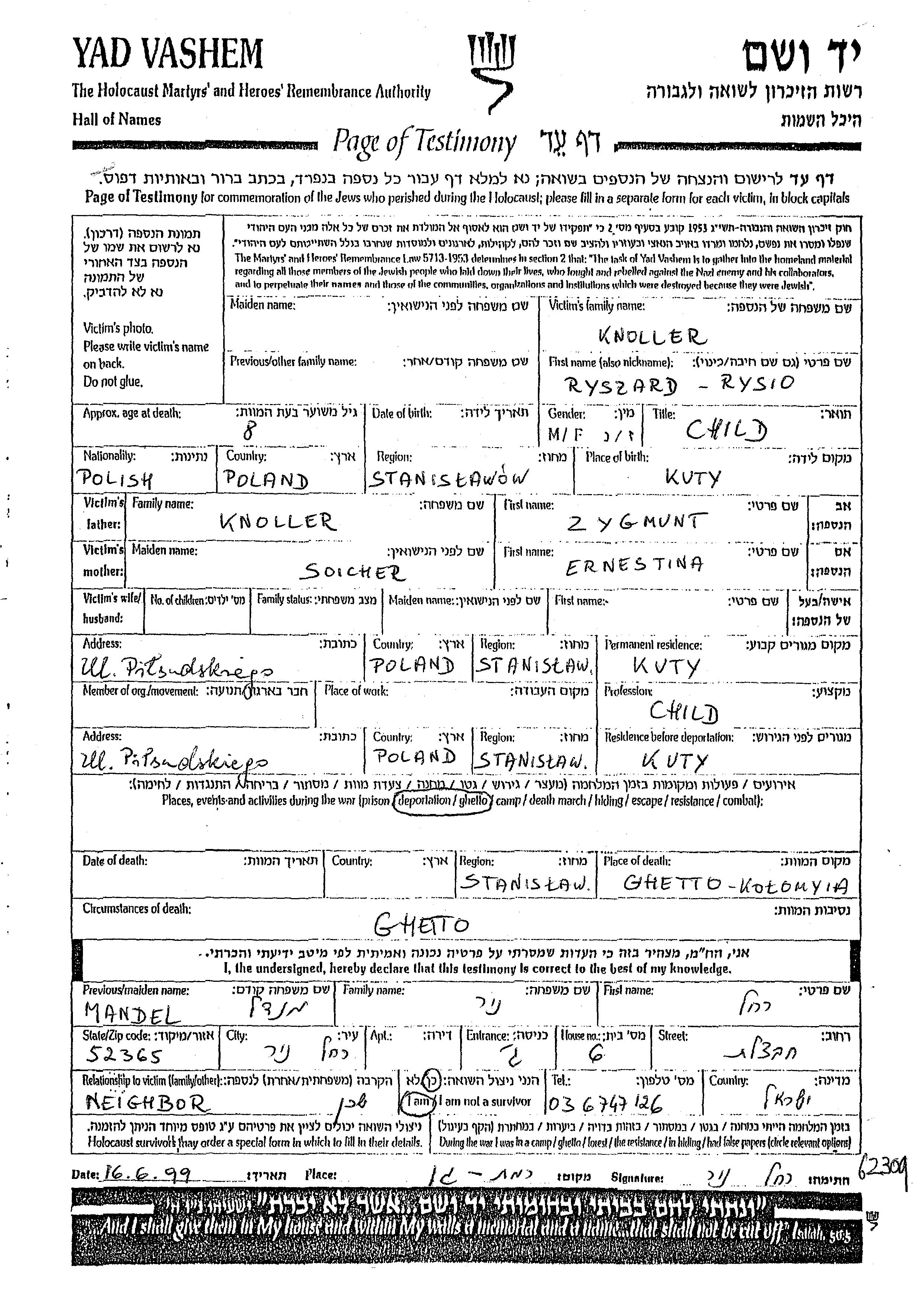 Knoller Ryszard Kuty, Polonia Hoja de Testimonio