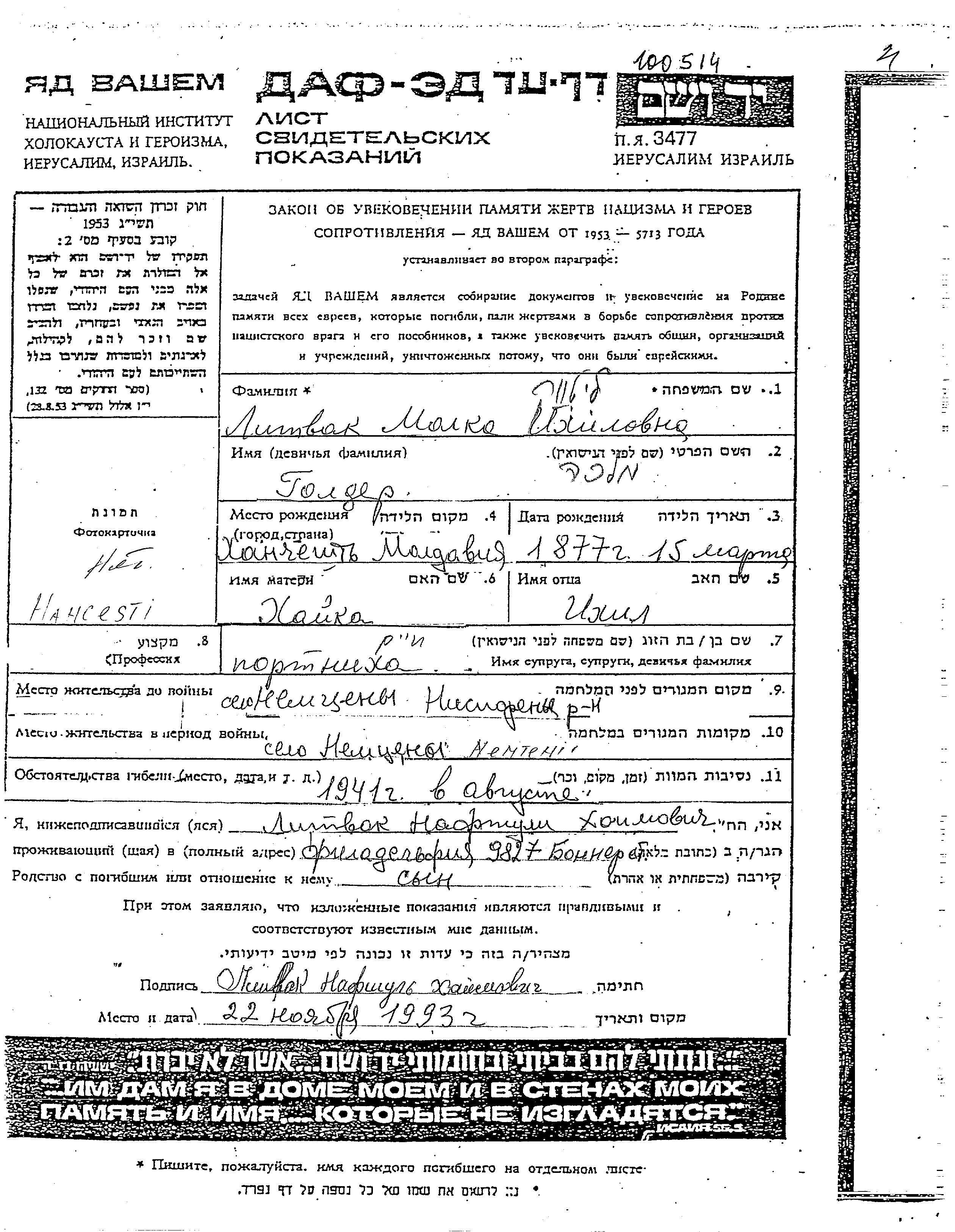 Molka fue asesinada durante la Shoá. Lugar de la muerte: Nemteni, Rumania en 1941.