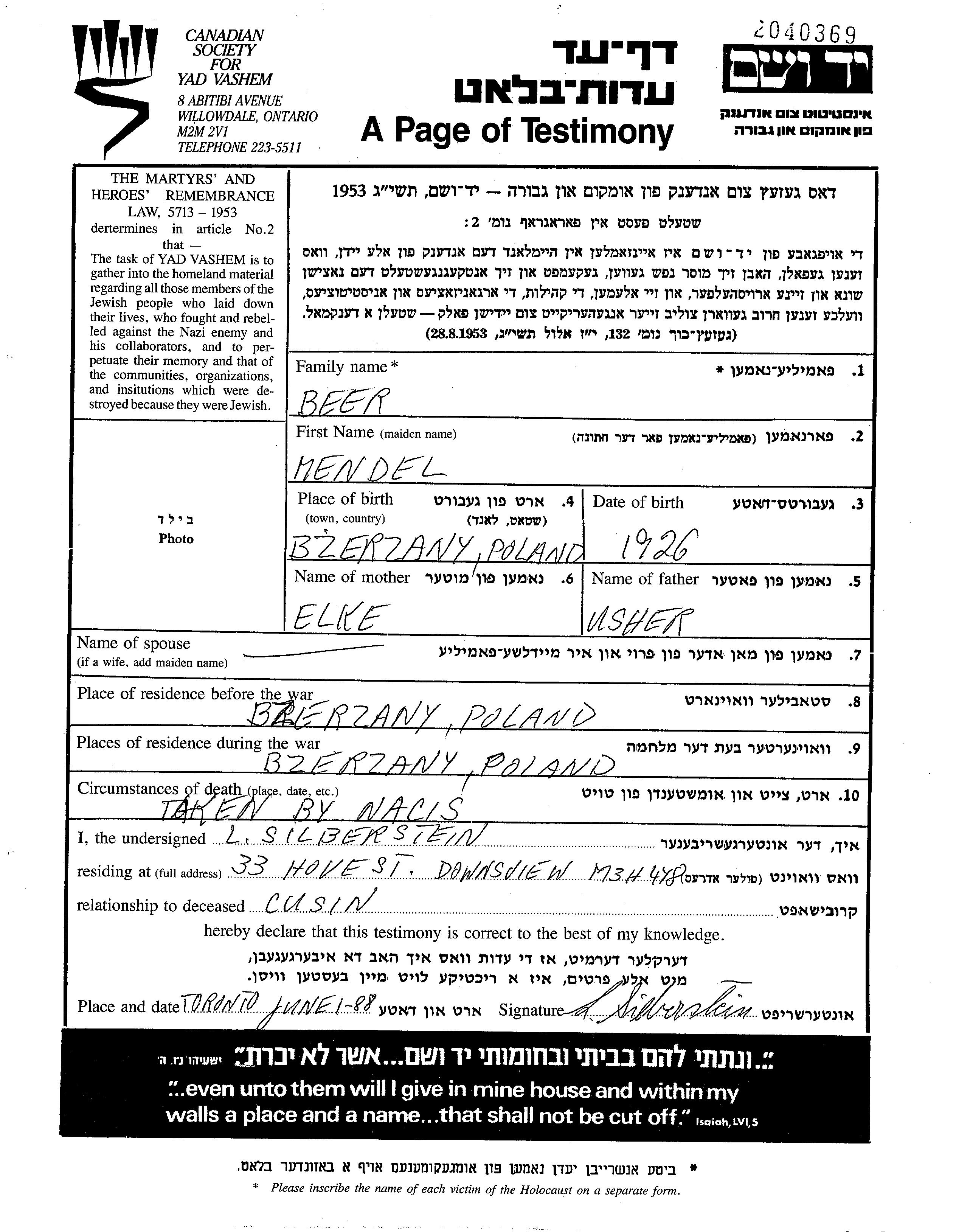 Mendel Beer nació en Brzeżany, Polonia en 1926, hijo de Usher y Elke. Era Niño. Antes de la segunda guerra mundial vivía en Brzeżany, Polonia. Durante la guerra estuvo en Brzeżany, Polonia.
