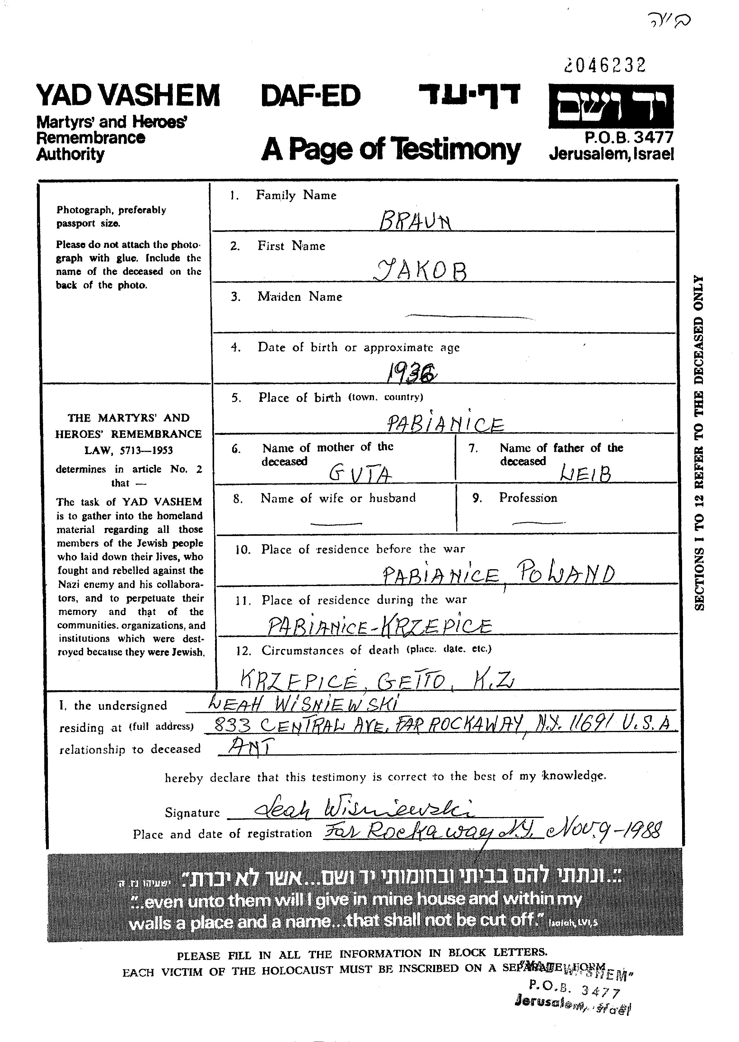 Braun Jakob 1936 Pabianice, Polonia Hoja de Testimonio