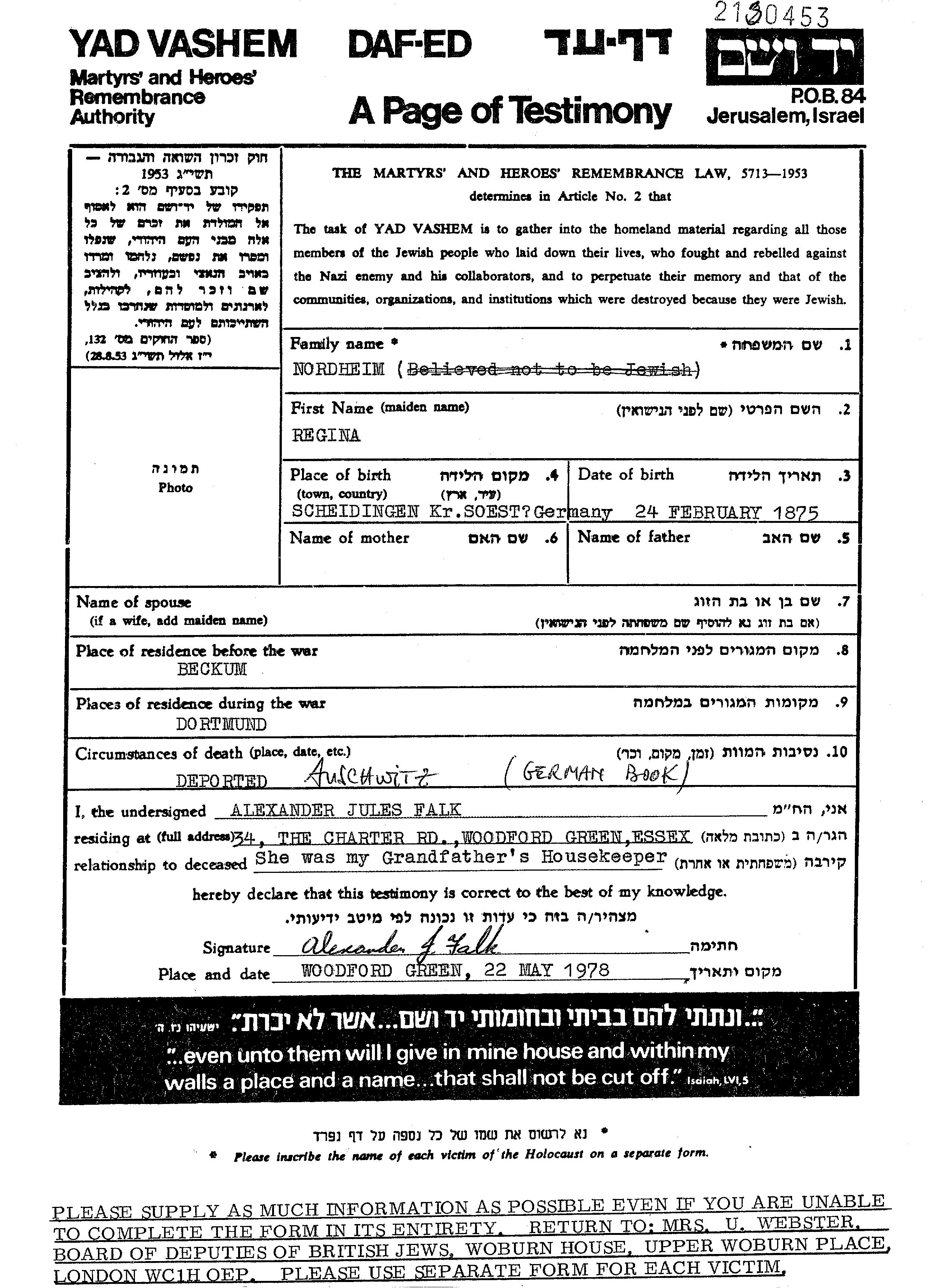 Regina Nordheim nació en Soest, Alemania en 1875. Antes de la segunda guerra mundial vivía en Beckum, Alemania. Durante la guerra estuvo en Dortmund, Alemania.
