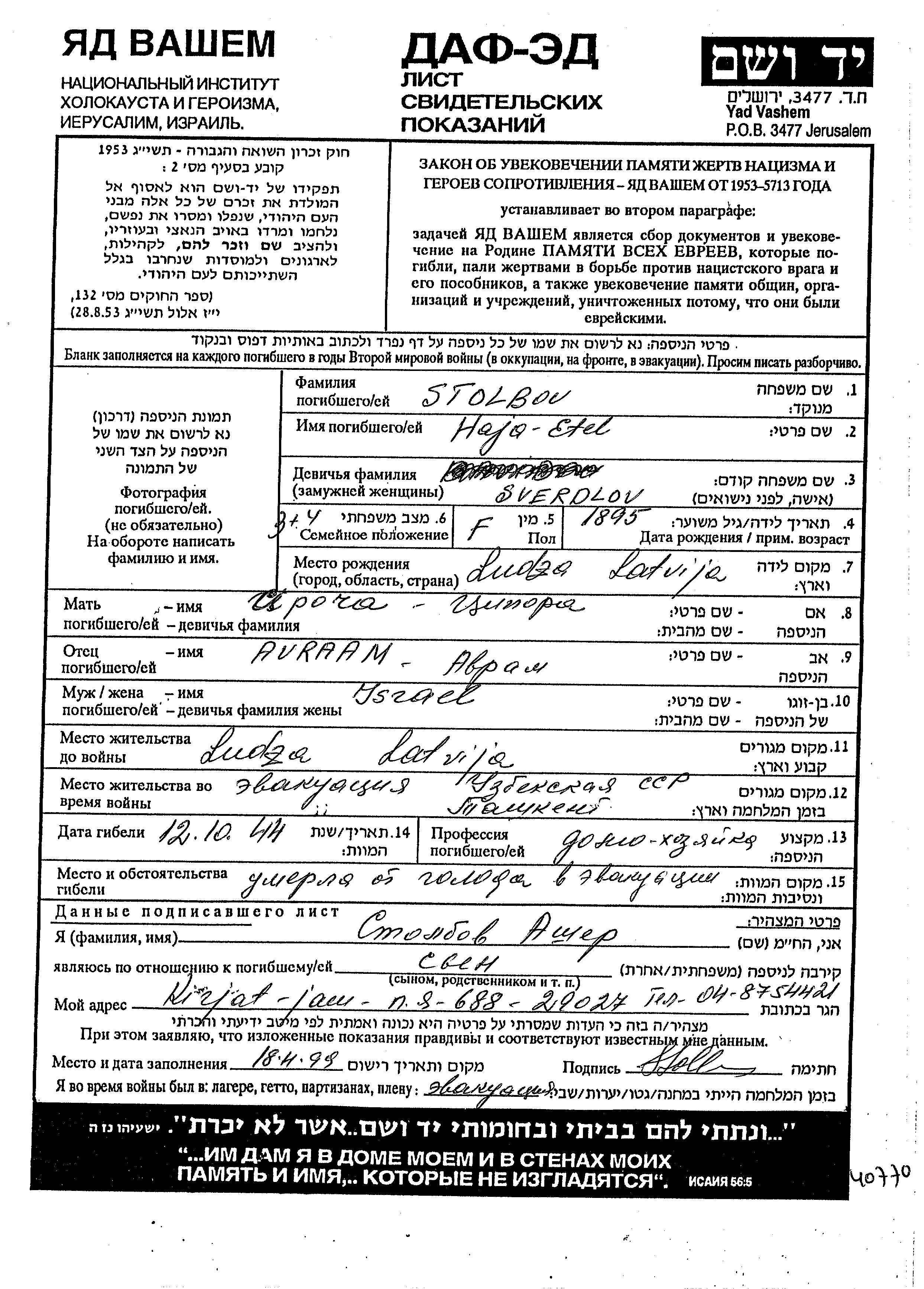 | Stolbov | Haja Ethel | 1891 | Ludza, Letonia | lista de habitantes judíos |