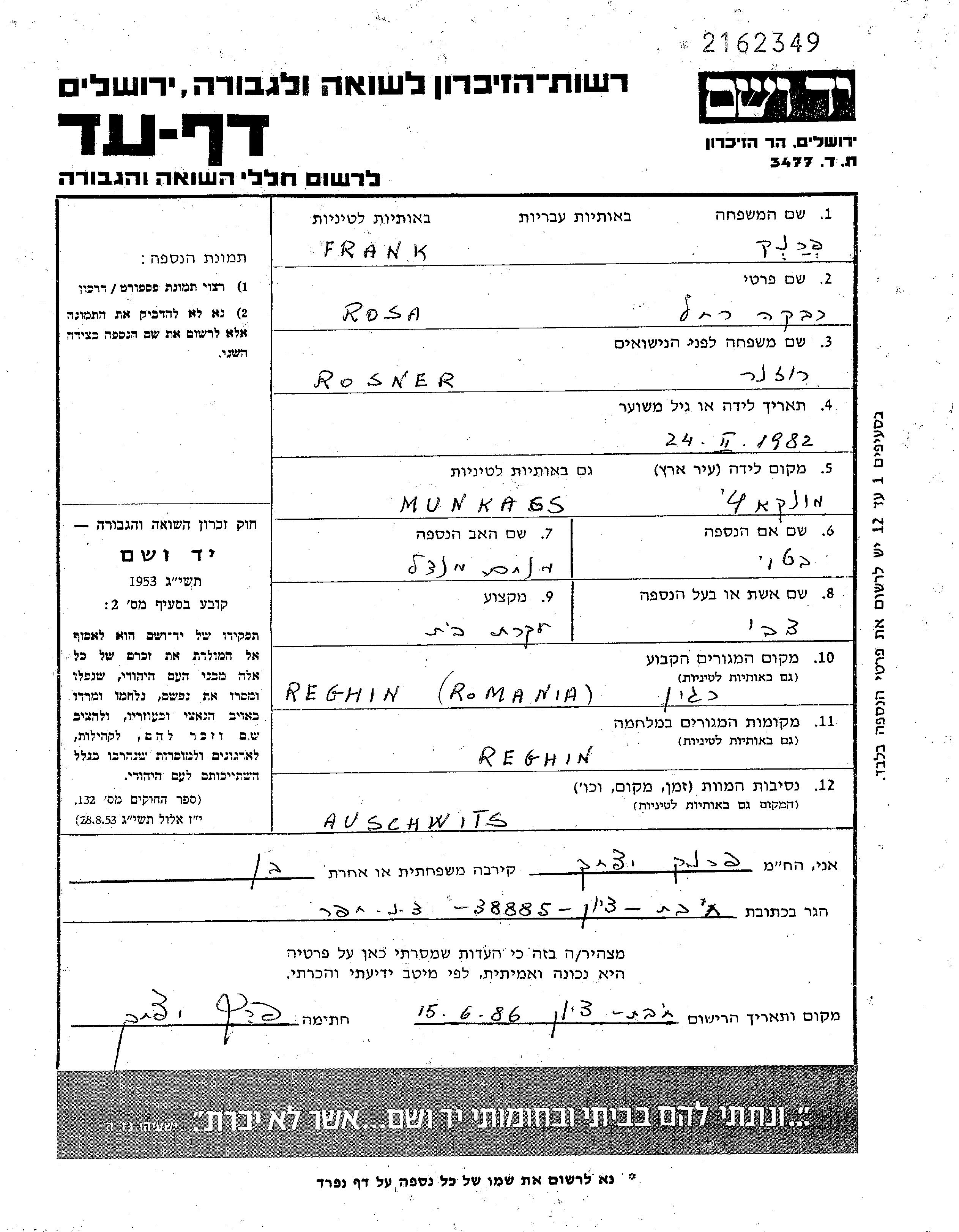Rosa Rakhel Rivka Frank apellido de soltera Rosner nació en Munkacs, Checoslovaquia en 1882, hija de Menakhem Mendel y Beti. Era Ama de casa y casada con Tzvi. Antes de la segunda guerra mundial vivía en Reghin, Rumania. Durante la guerra estuvo en Reghin, Rumania.