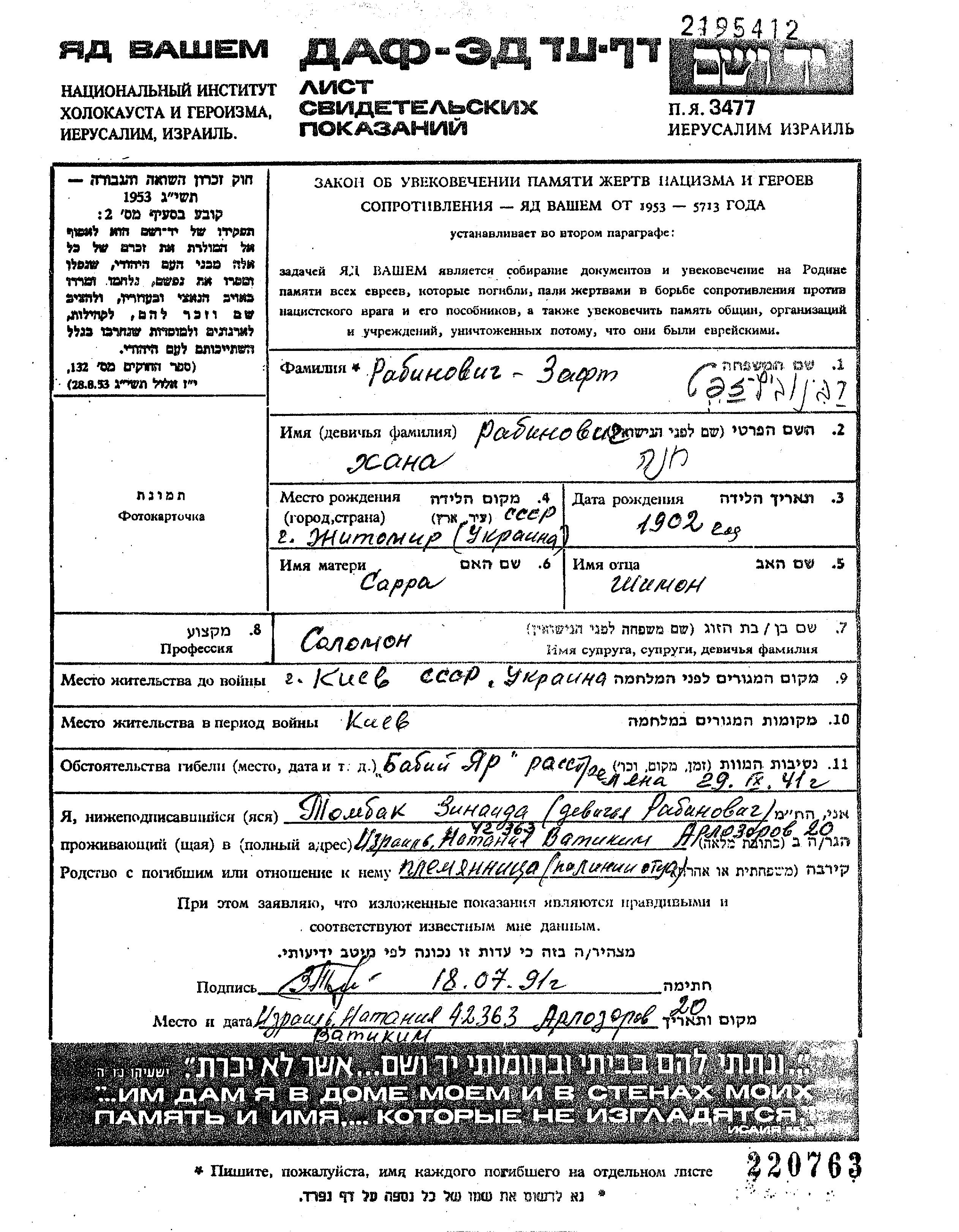 Rabinovich Khana 1902 Kiyev, Ucrania (URSS) Hoja de Testimonio