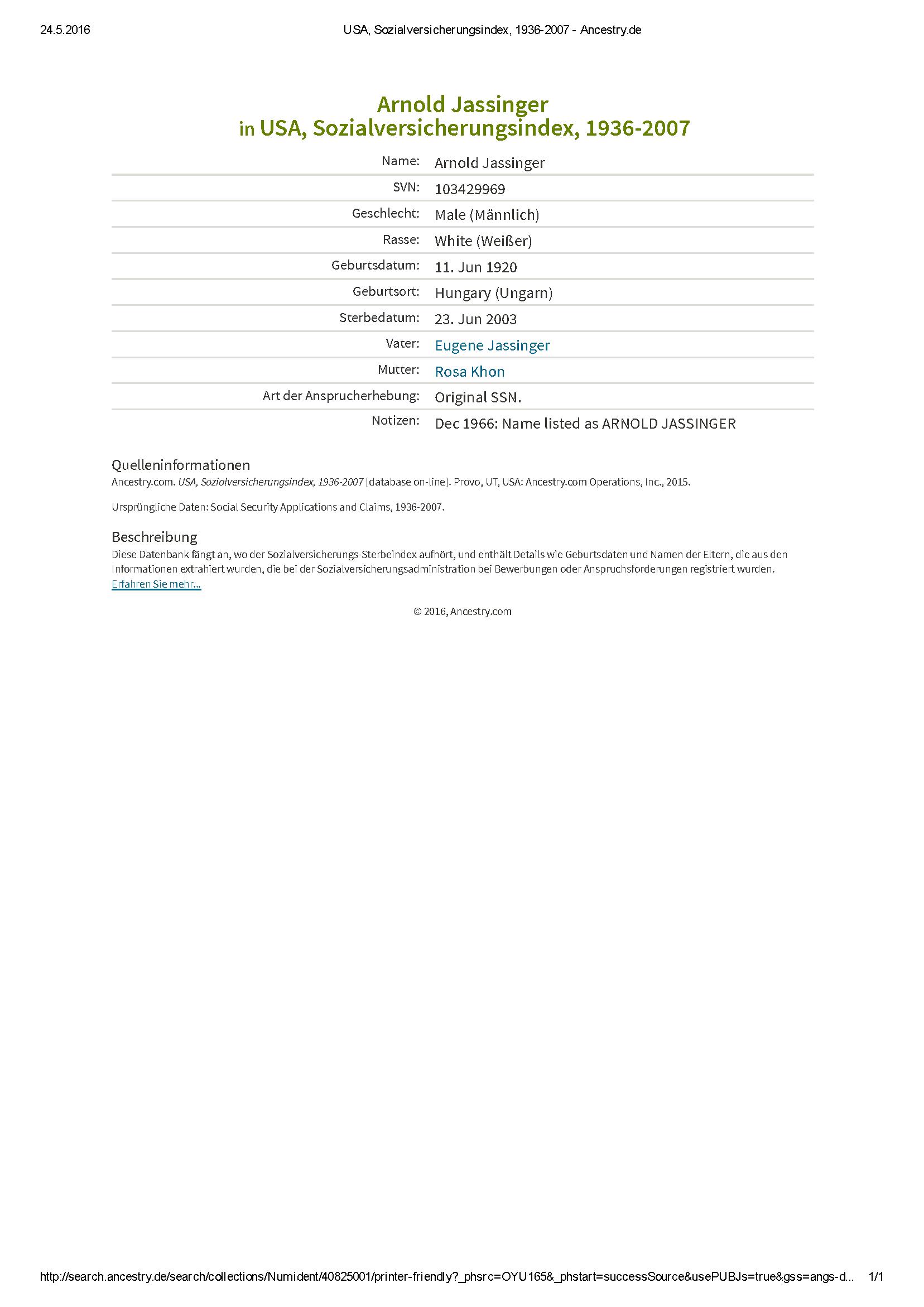 | Jassinger | Arnold | 1920 | lugar desconocido, | Record from public input |