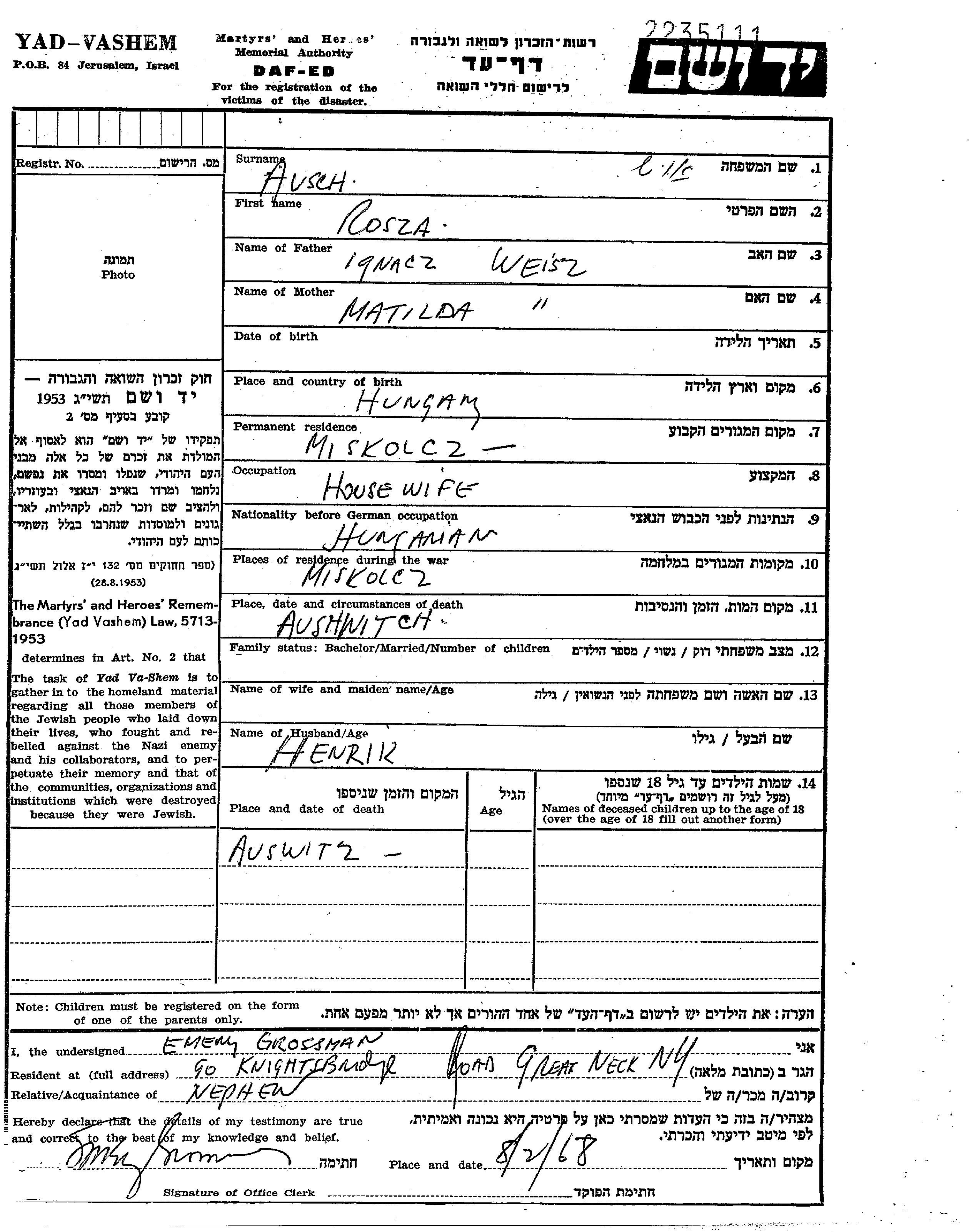Ausch Rosza Roza Miskolc, Hungría Hoja de Testimonio