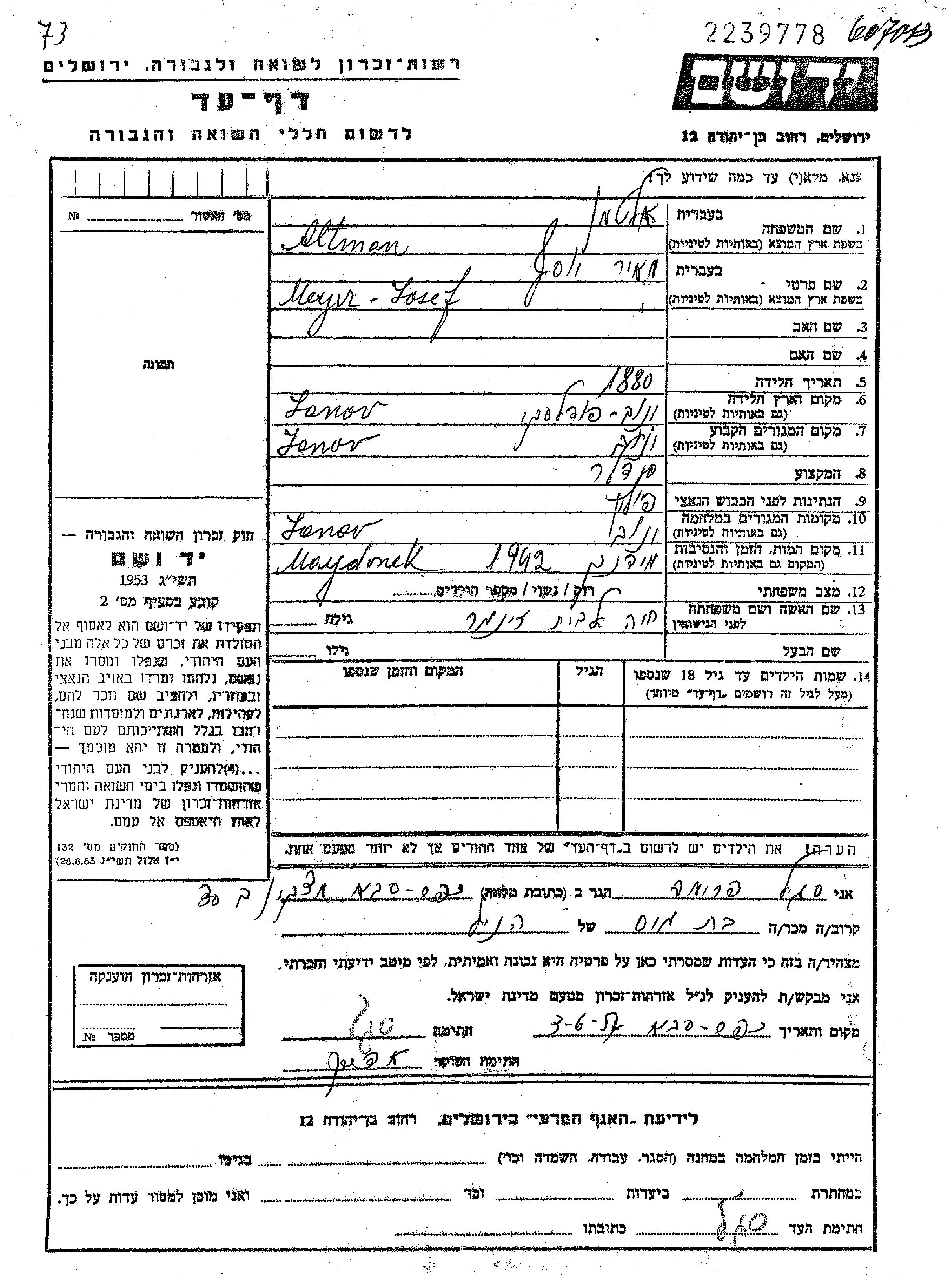 Altman Meyir Josef 1880 Janow Podlaski, Polonia Hoja de Testimonio