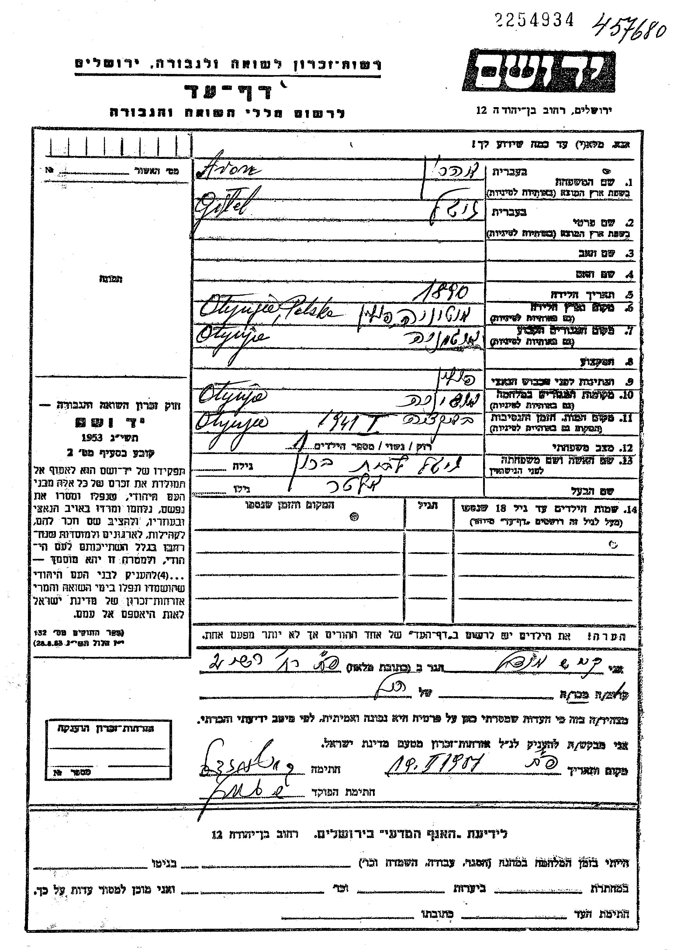 Aron Aharon Gitel 1890 Ottynia, Polonia Hoja de Testimonio