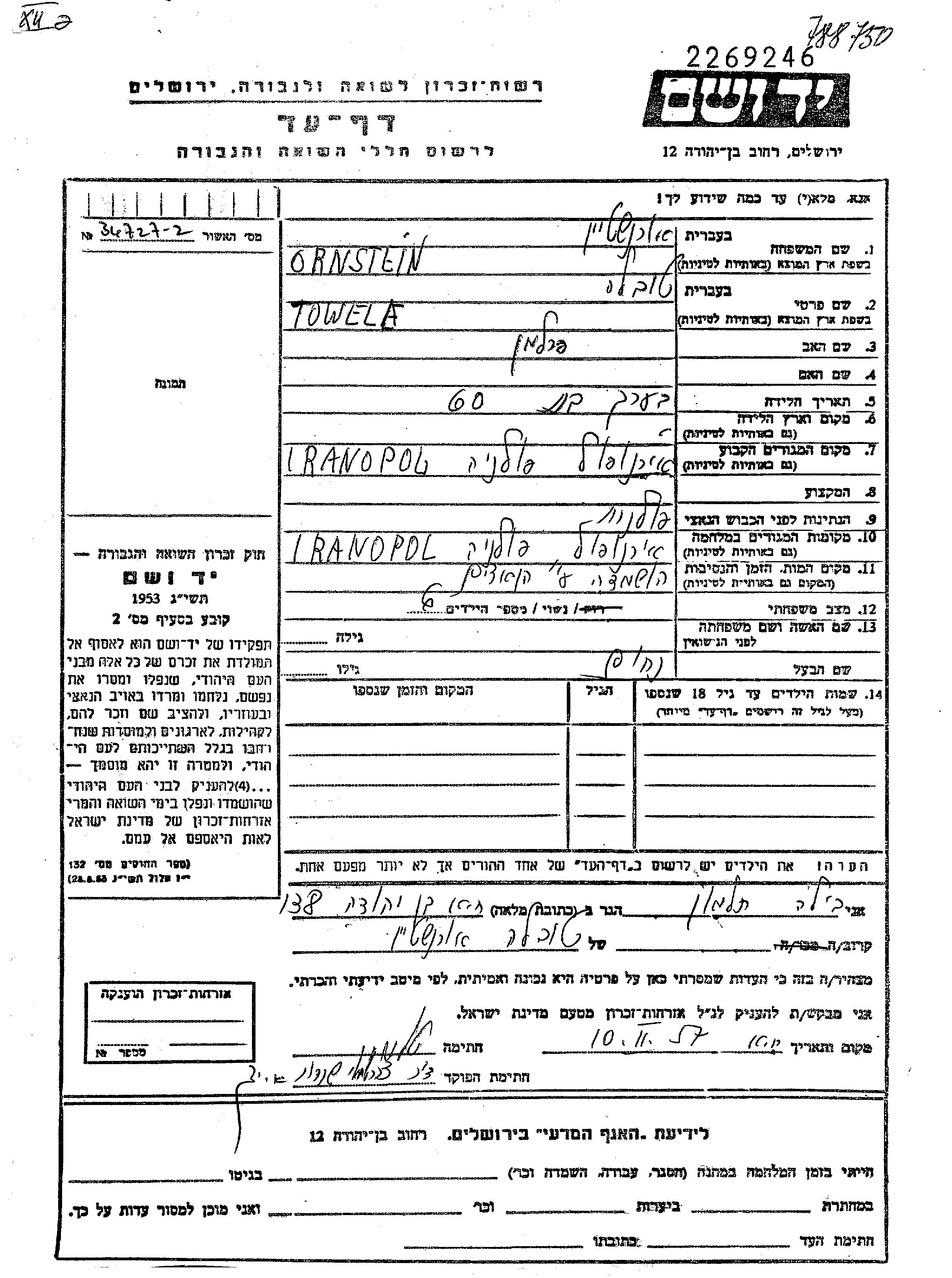 Ornstein Towa Tarnopol, Polonia Hoja de Testimonio