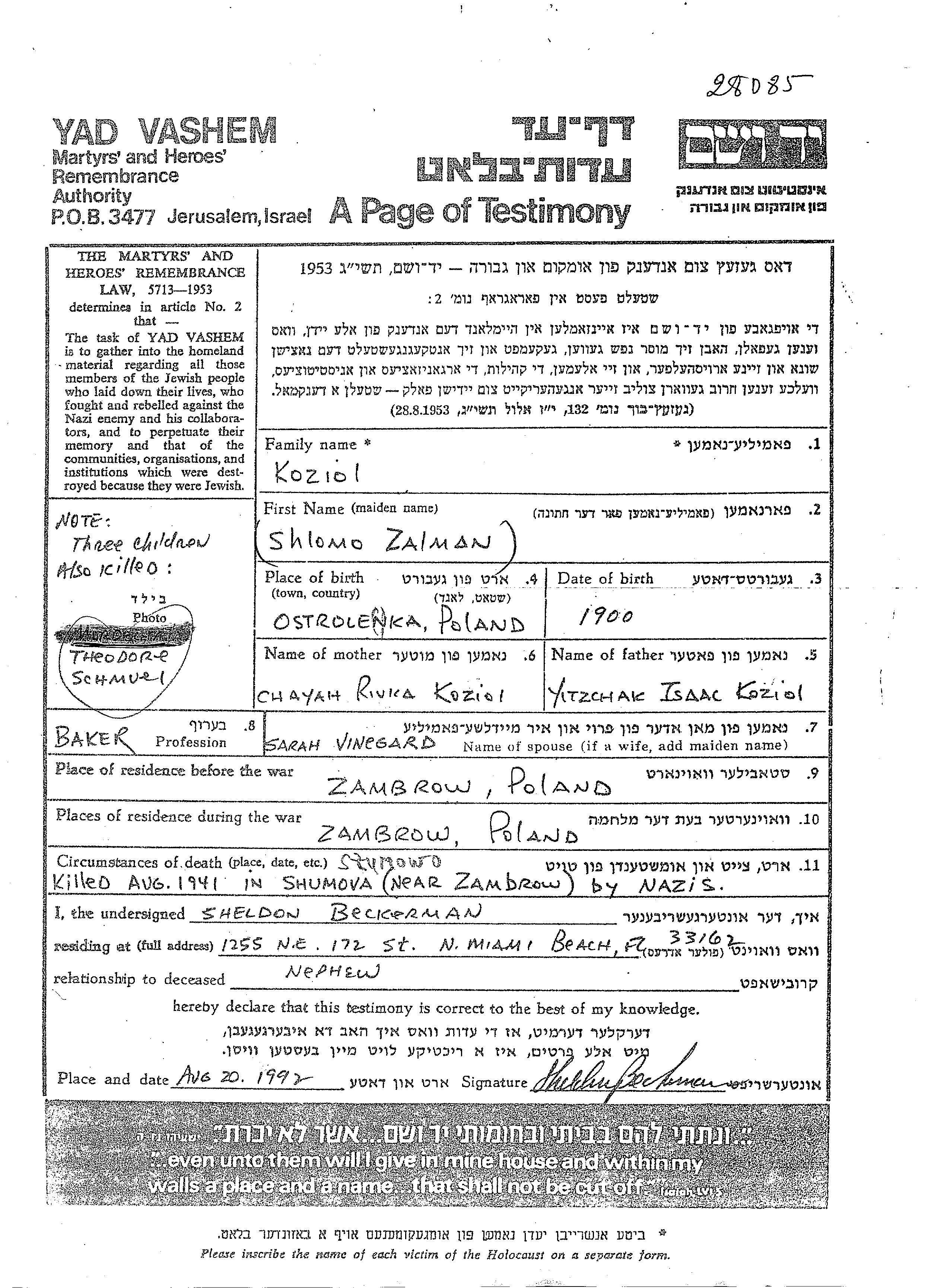 Koziol Mordechai Zambrow, Polonia Hoja de Testimonio