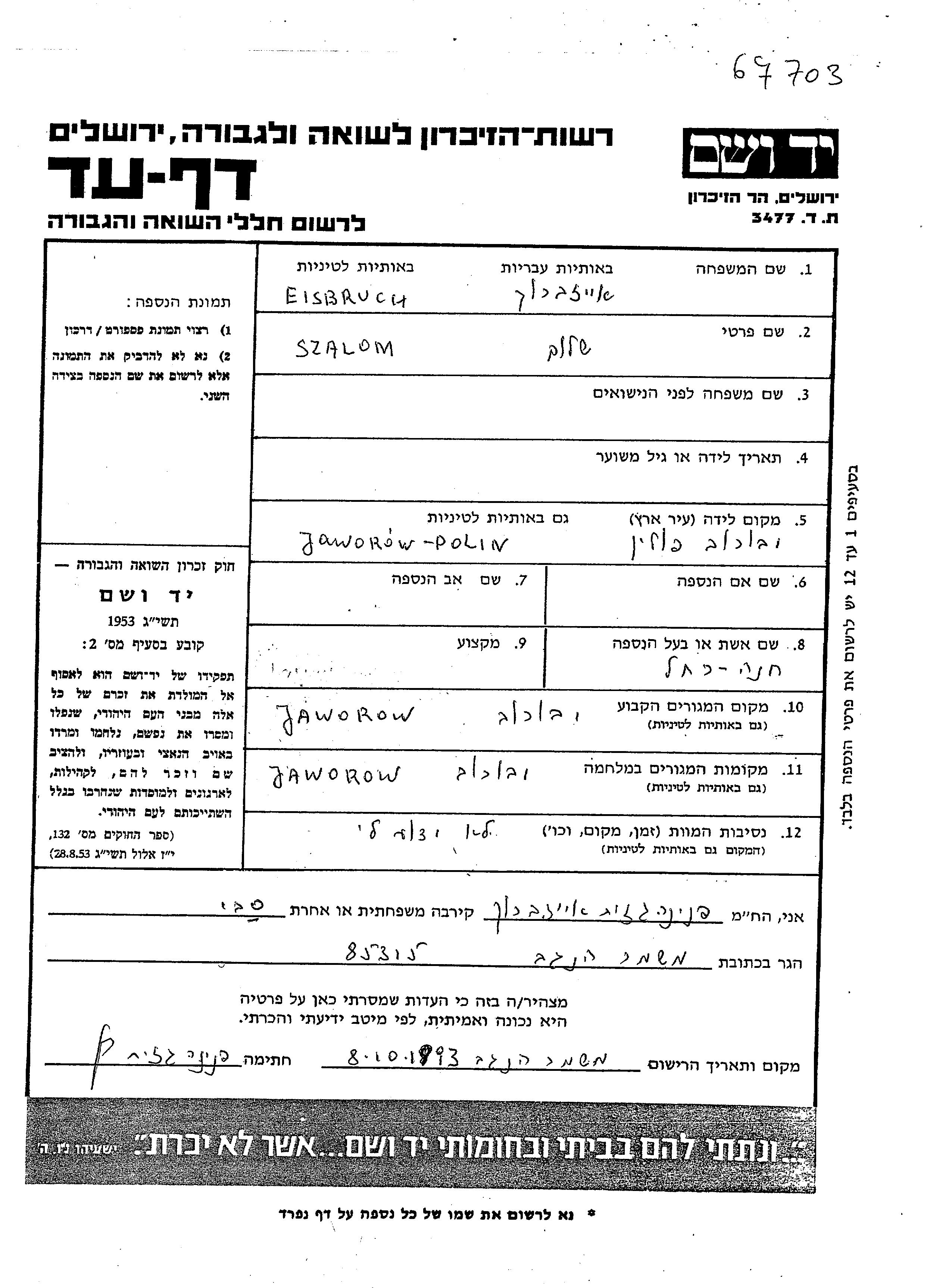 Eisbruch Szalom Jaworow, Polonia Hoja de Testimonio
