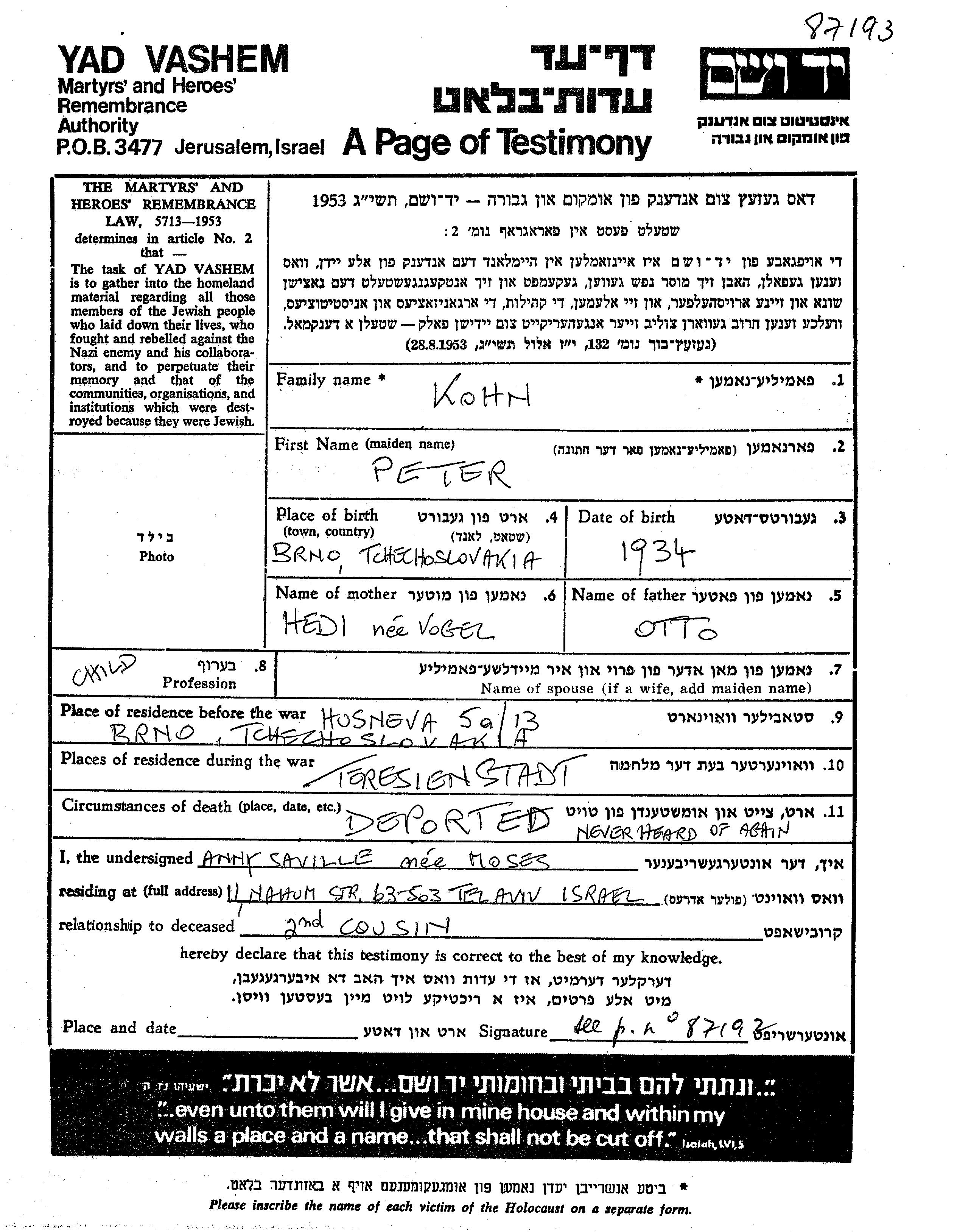 Kohn Kun Peter 1934 Brno, Checoslovaquia Hoja de Testimonio