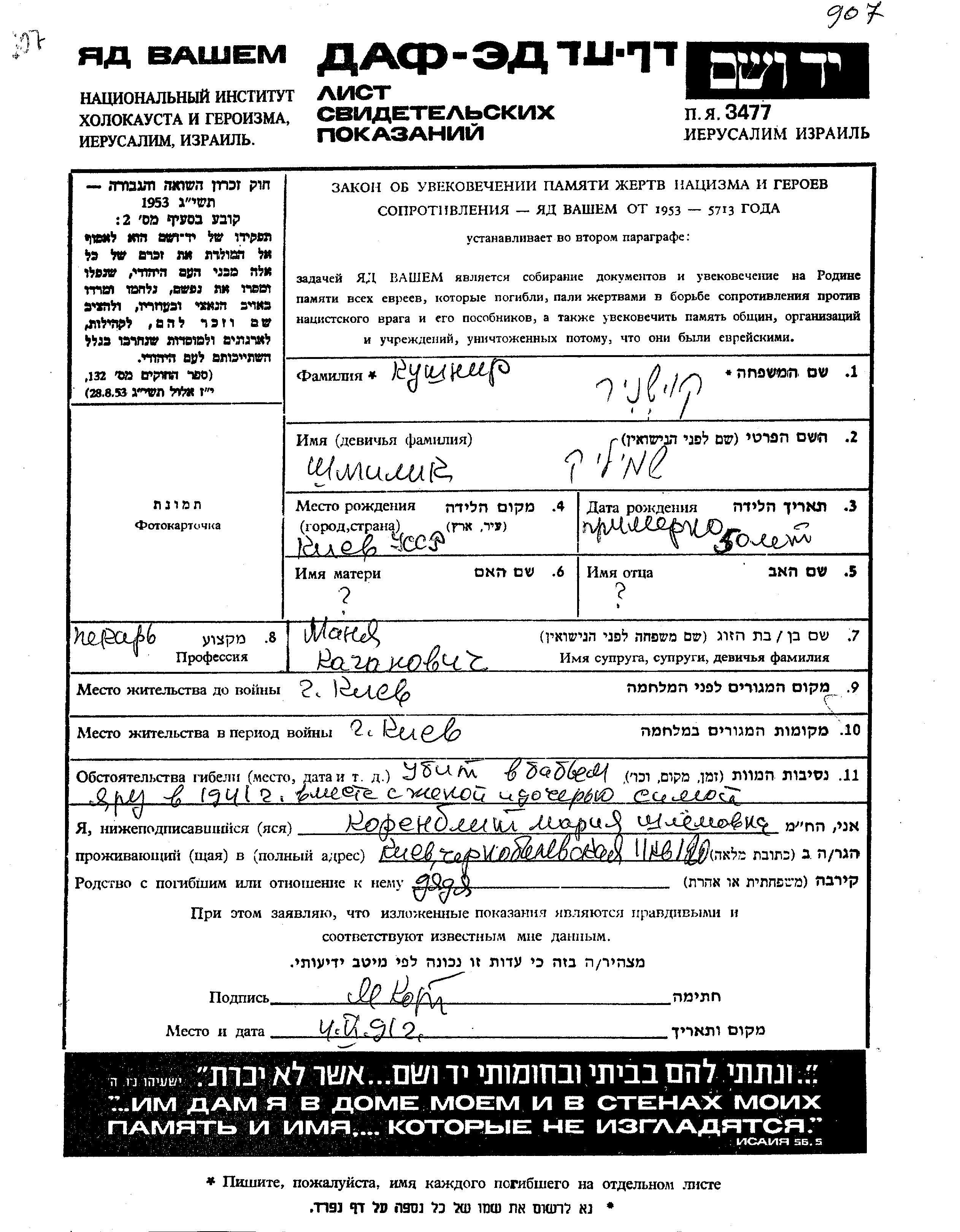 Kushnir Shmilik 1891 Kiyev, Ucrania (URSS) Hoja de Testimonio