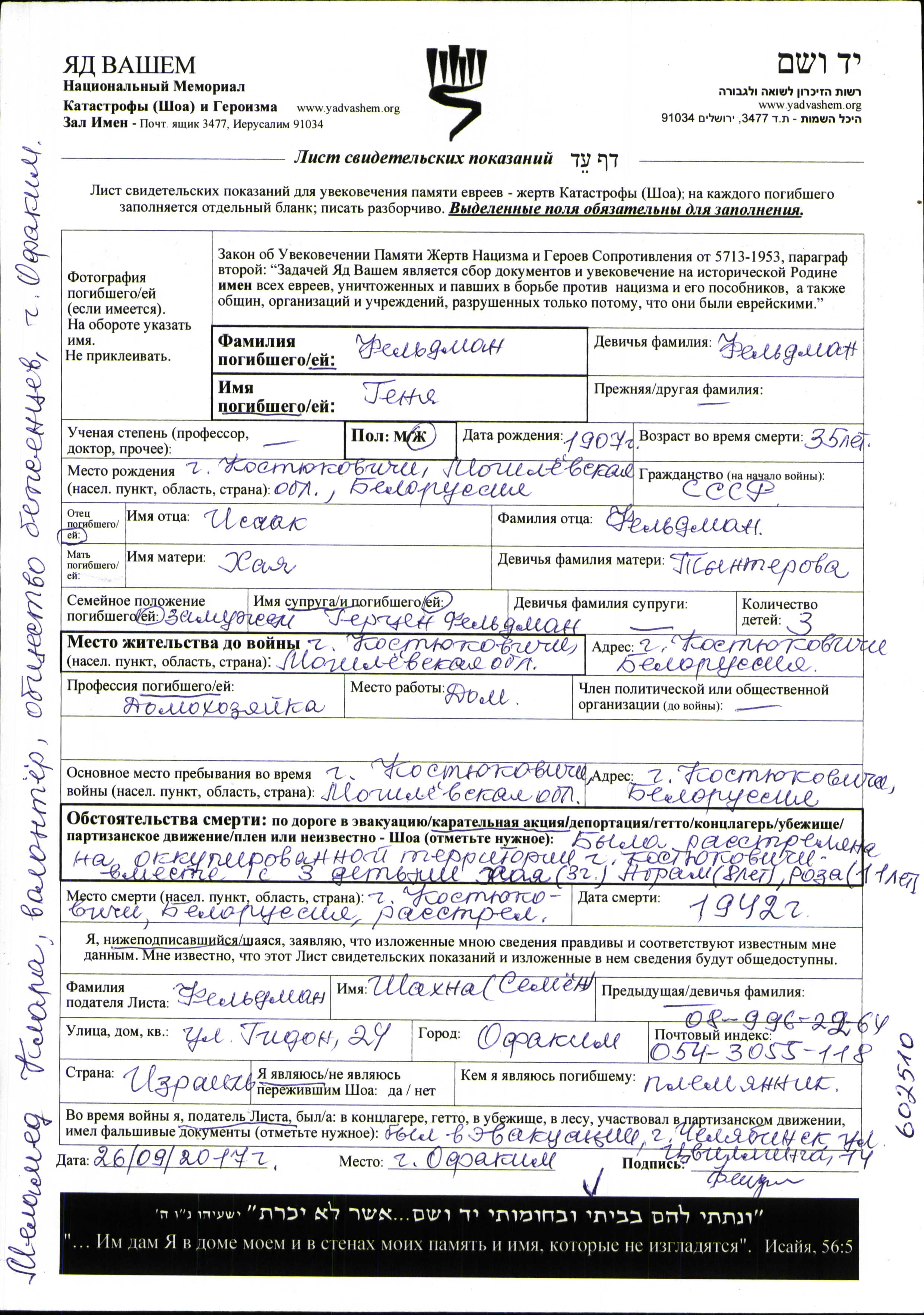 Feldman Genya 1907 Kostyukovichi, Bielorrusia (URSS) Hoja de Testimonio