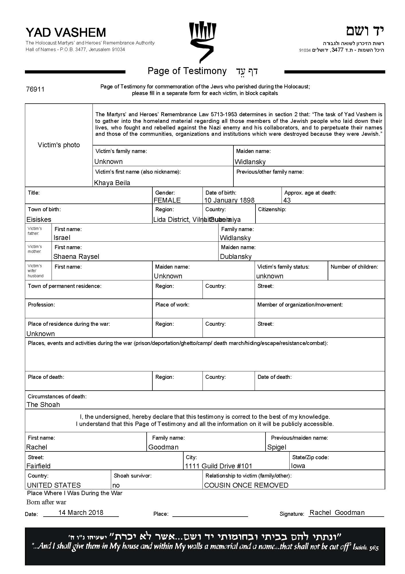 apellido desconocido Khaya Beila 1898 lugar desconocido, Hoja de Testimonio (digital)