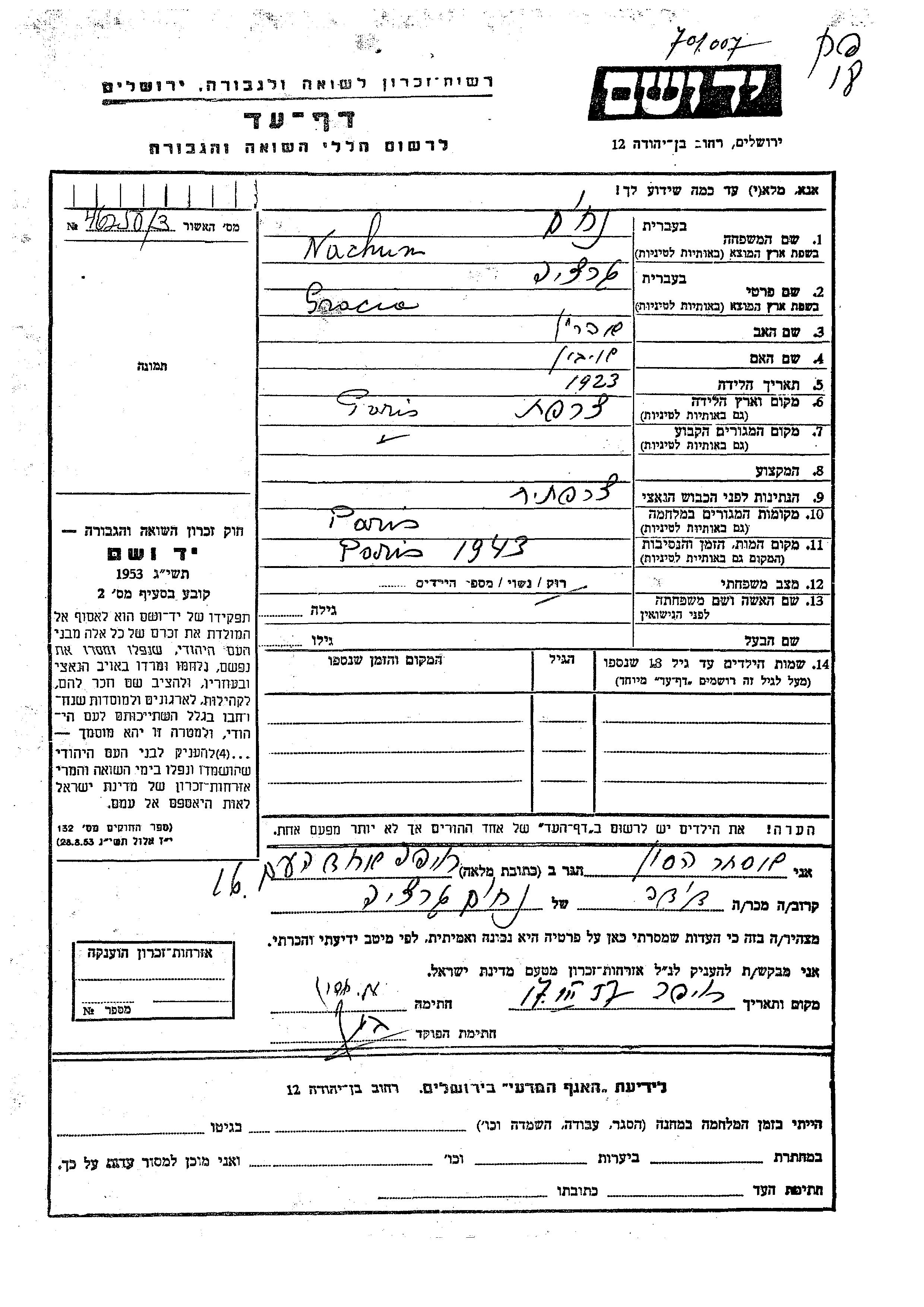 Nachum Gracia 1923 Paris, Francia Hoja de Testimonio
