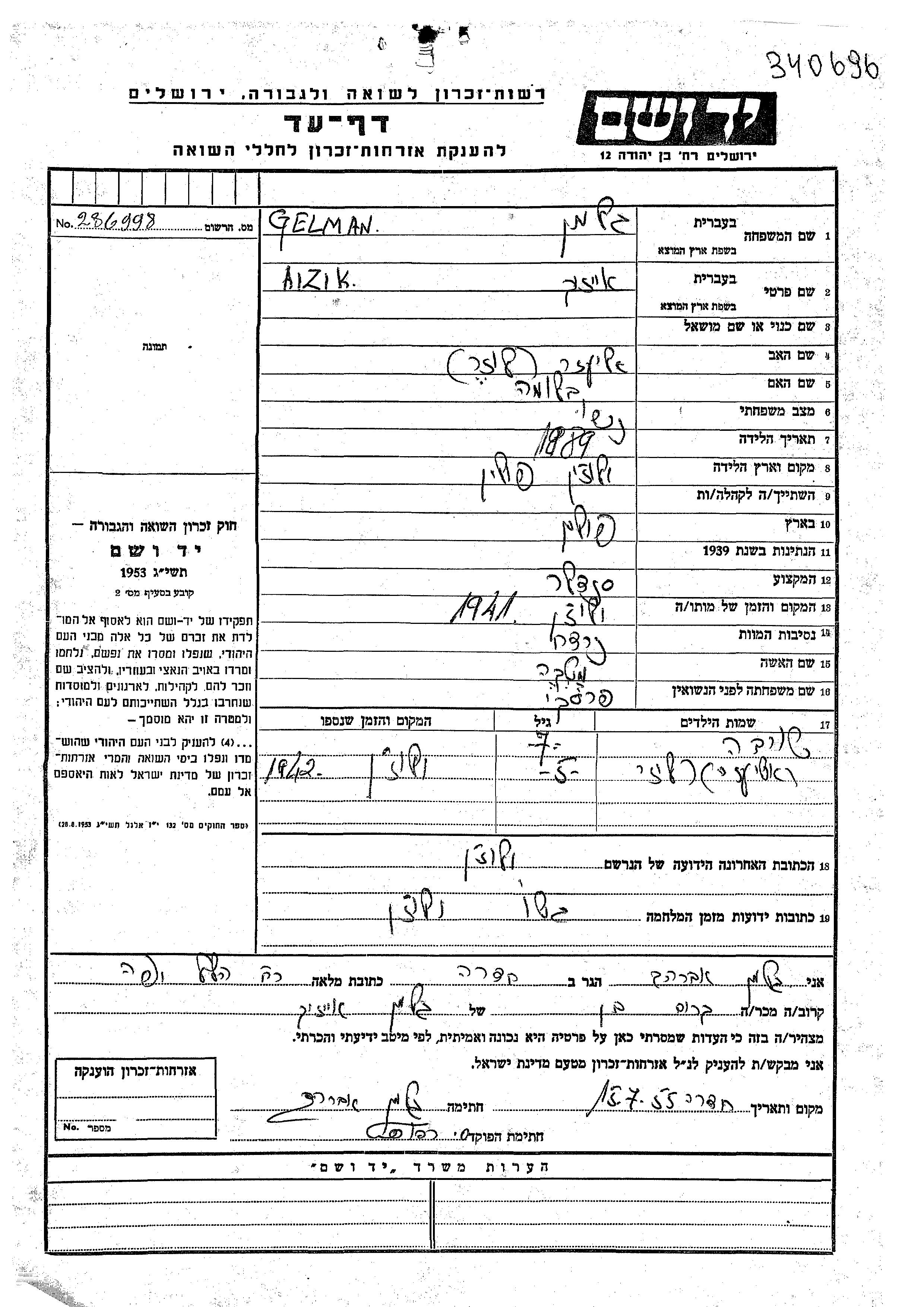 Aizik Gelman nació en Wlocin, Polonia en 1889, hijo de Eliezer y Bluma. Era Zapatero/a y Casado con Matke apellido de soltera Perski. Antes de la segunda guerra mundial vivía en Wlocin, Polonia. Durante la guerra estuvo en Wlocin, Polonia.