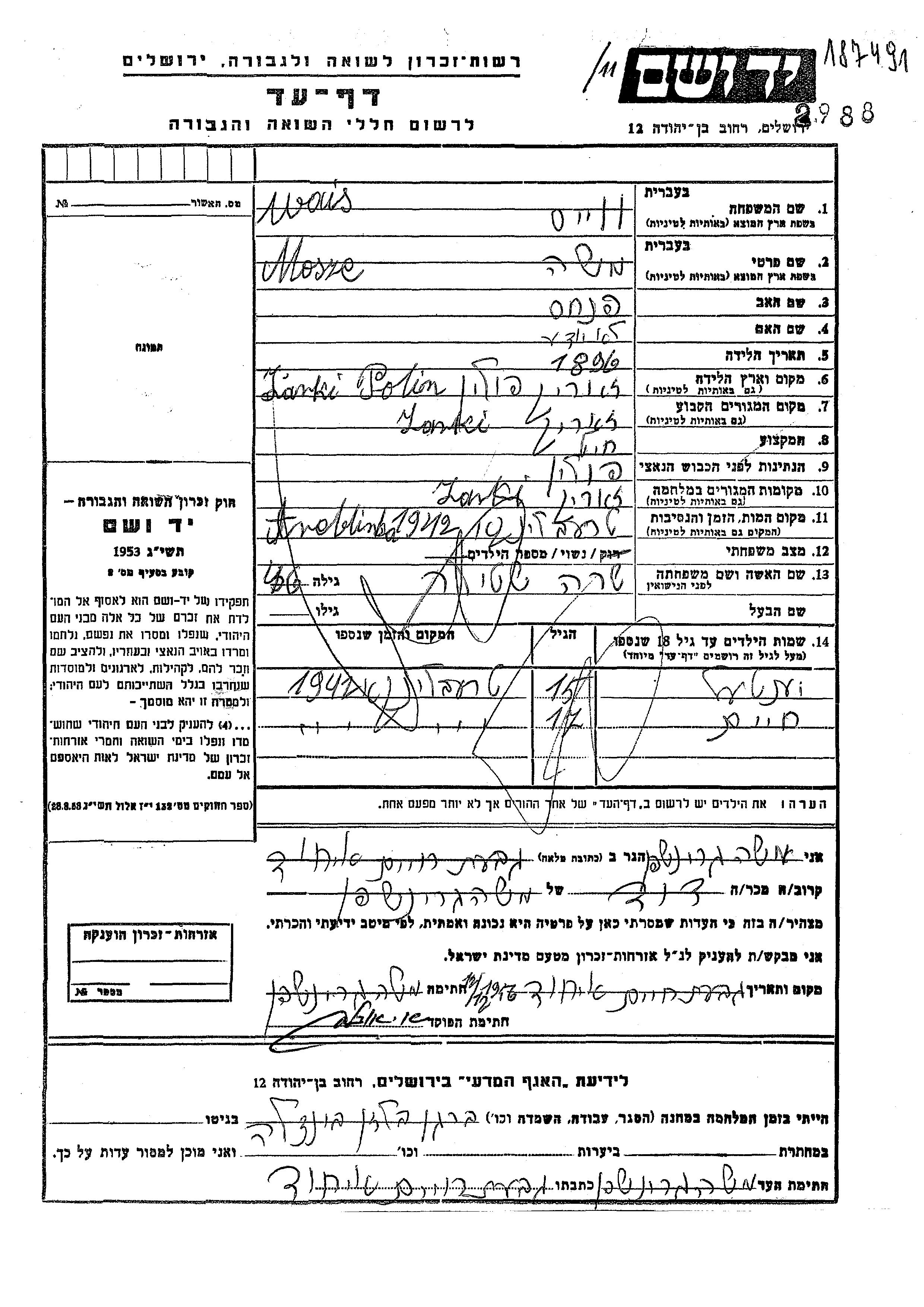 Moshe Weis nació en Zarki, Polonia en 1896. Era Sastre. Antes de la segunda guerra mundial vivía en Zarki, Polonia.