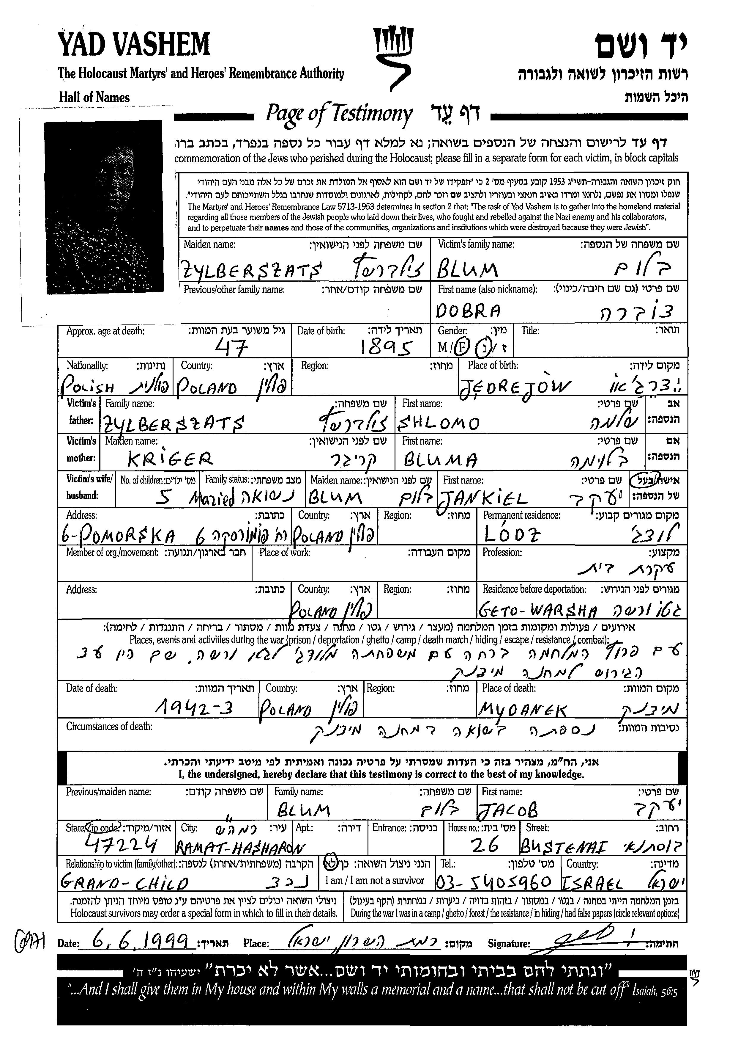 Dobra Dora Blum apellido de soltera Zylberszatz nació en Jedrzejow, Polonia en 1895. Era Ama de casa. Antes de la segunda guerra mundial vivía en Lodz, Polonia.