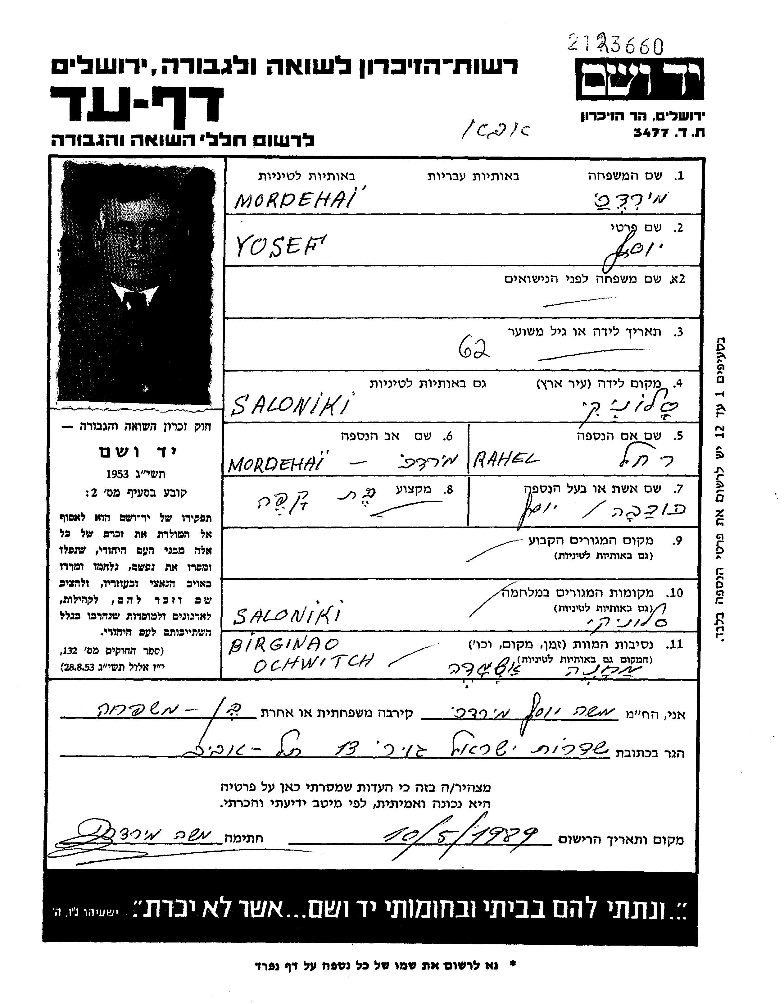 Mordehai Yosef lugar desconocido, Hoja de Testimonio