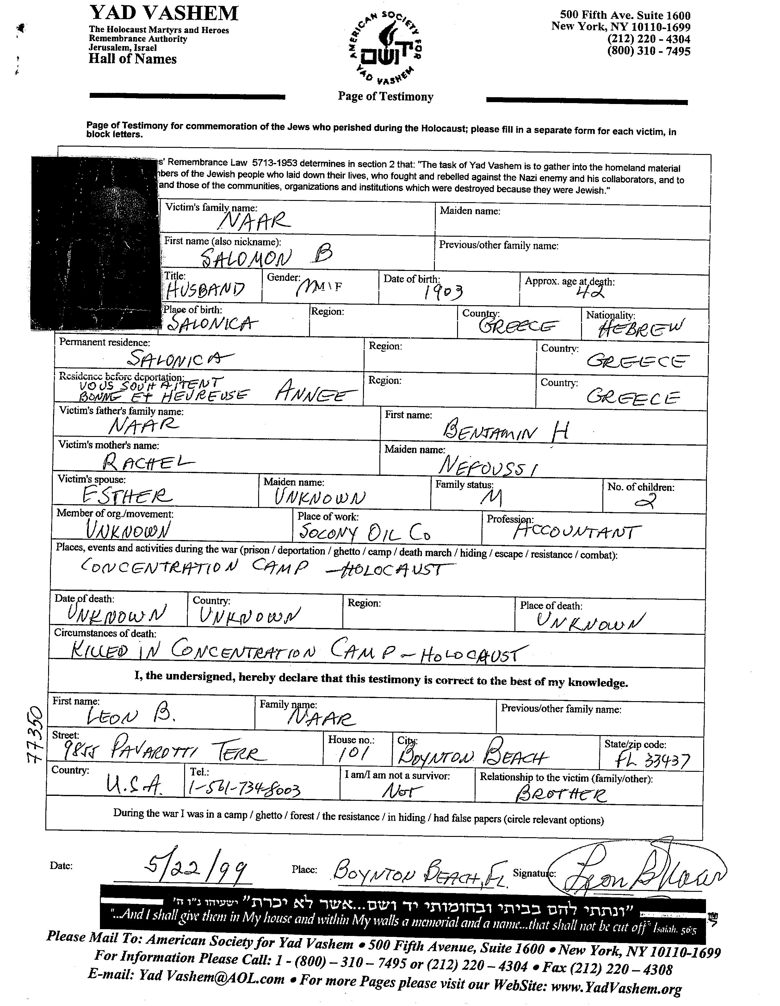 Salomon B Naar nació en 1903. Era Tenedor/a de libros. Antes de la segunda guerra mundial vivía en Thessaloniki, Grecia.