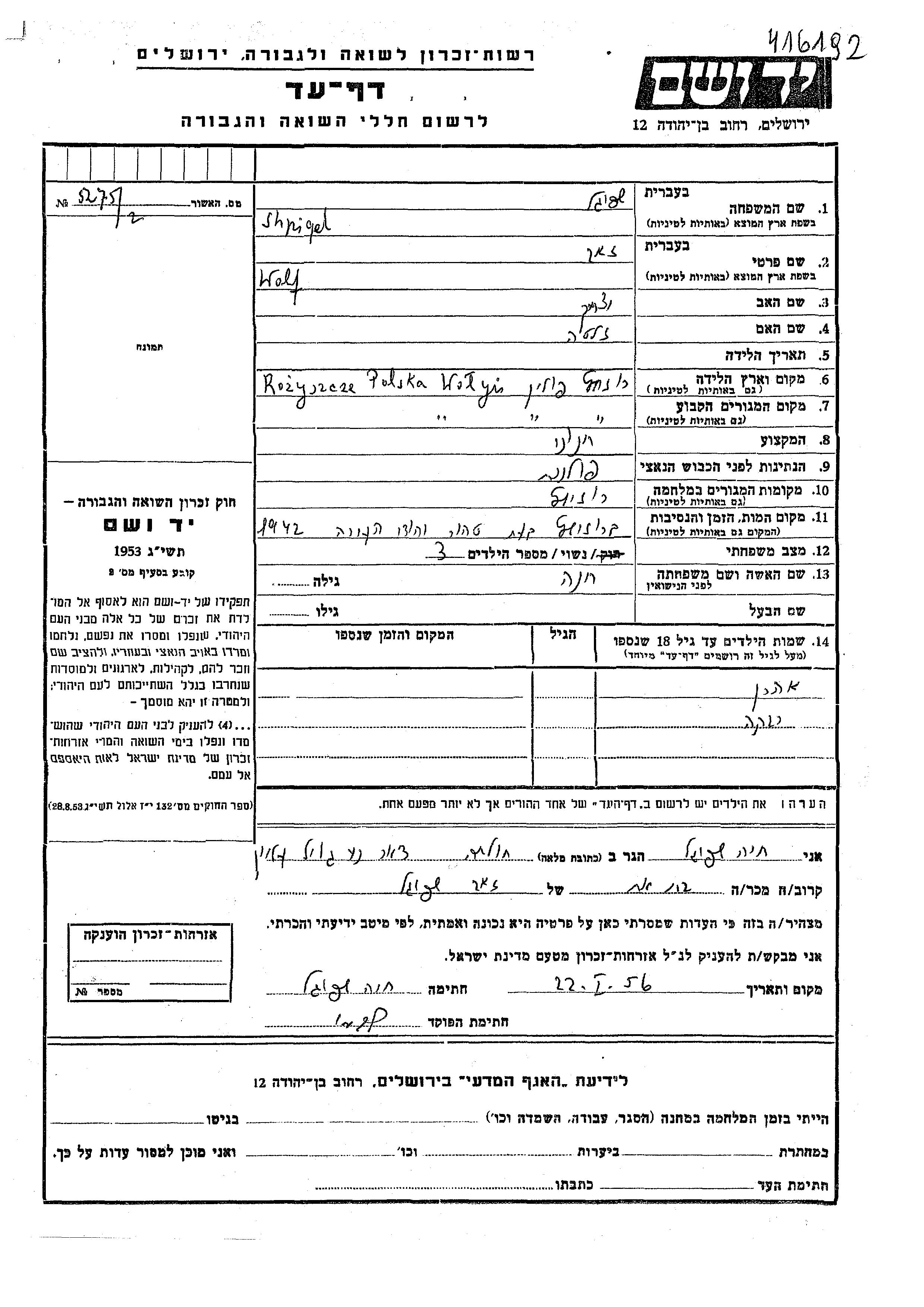 Shpigel Volf Zeev Rozyszcze, Polonia Hoja de Testimonio